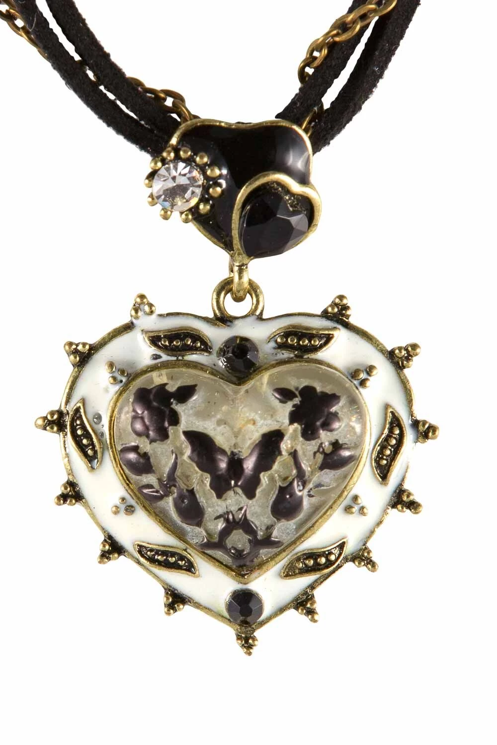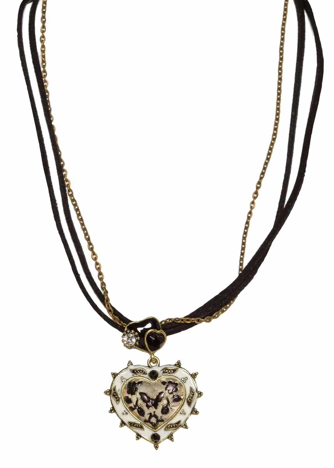 Trachtencollier Herz schwarz, elfenbein 165 201 der Marke OWA. Das Herz ist in altmessing gefasst und hängt an einer längenverstellbaren altmessing Gliederkette und 2 schwarzen Lederbänder.