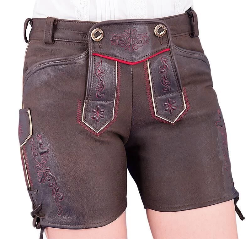 Die kurze Lederhose Nena-4 in feinstem Kalbs-Nubuk in der Farbe braun antik ist mit plastischen Stickereien an den seitlichen Beinen, auf der Rückseite und am Latz verziert. Die Stickereien sind mit einem roten Farben umnäht. Eine Schnürung mit Lederbändchen befindet sich links und rechts am Beinabschlusss.