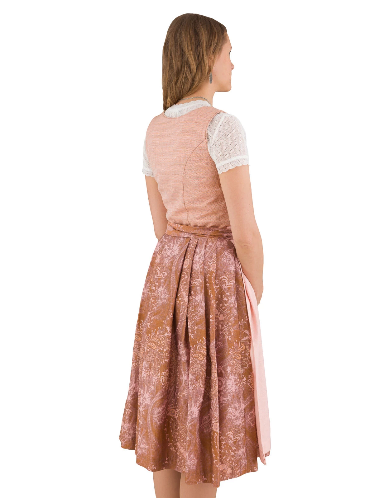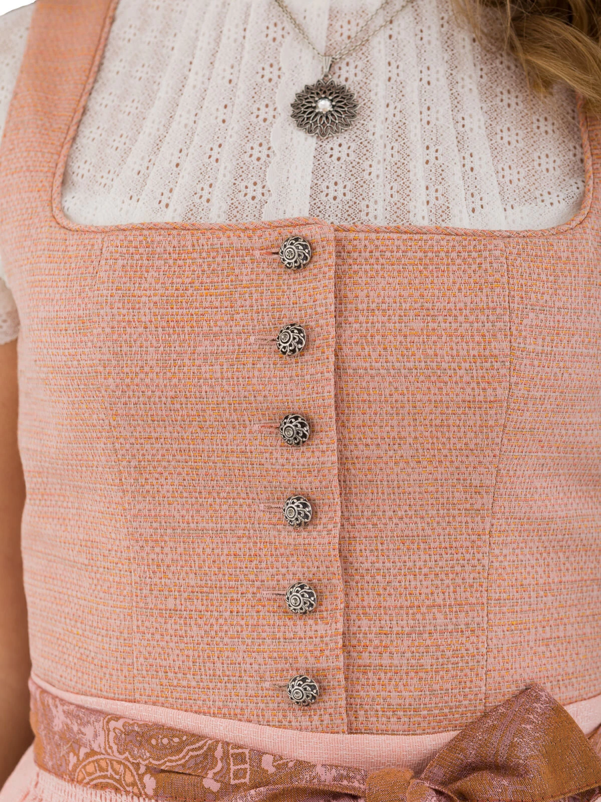 Das Apricot-farbene Midi Dirndl ist ein Must-have für jede moderne Frau, die Wert auf Stil und Eleganz legt. Die Altsilberknöpfe verleihen dem Dirndl eine zeitlose Eleganz im Chanel-Stil und bringen Ihre Weiblichkeit wunderbar zur Geltung.