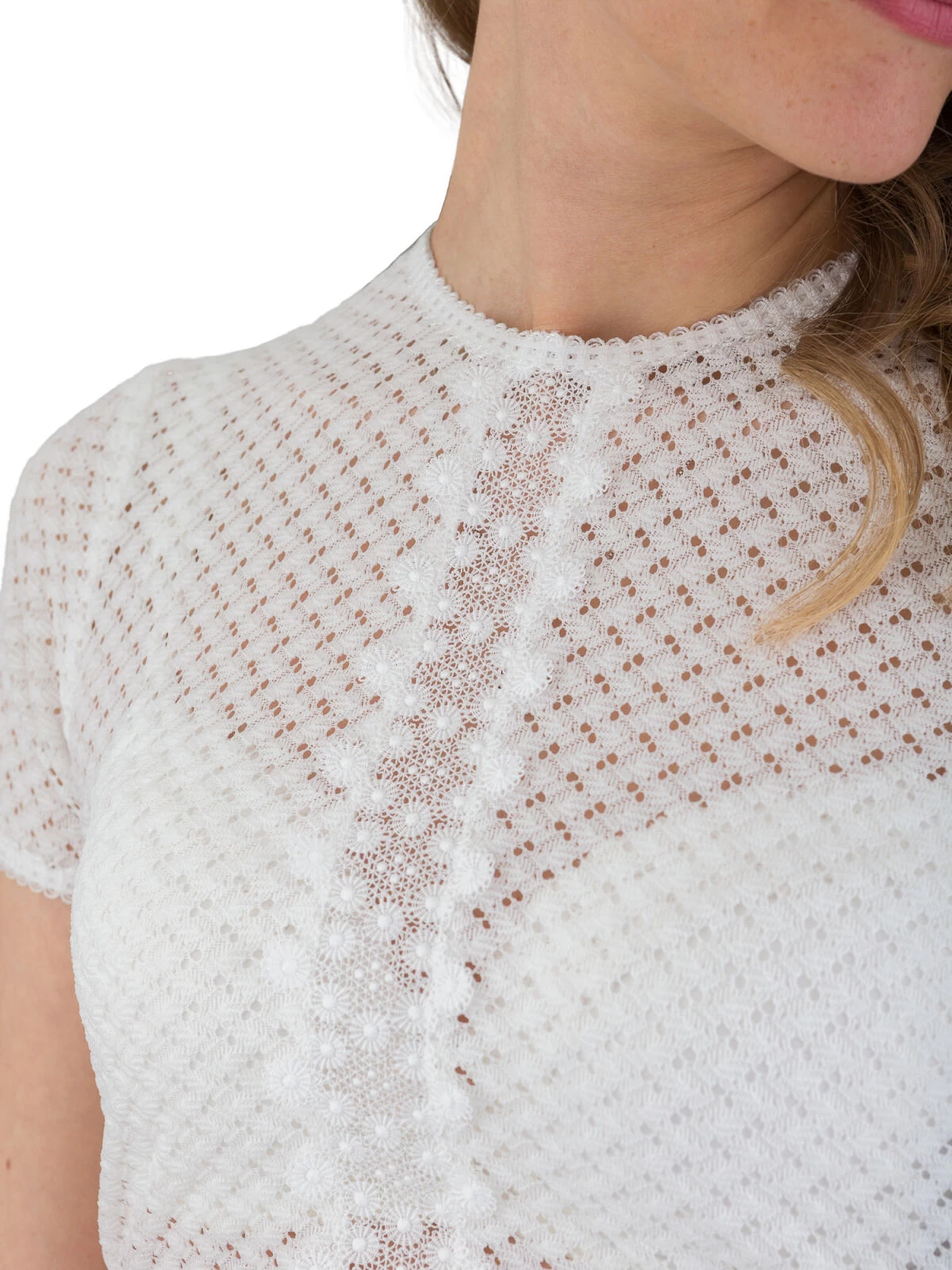 Dank des besonderen Spitzenmusters auf der Vorderseite wird die Bluse zu einem wahren Hingucker und verleiht Ihrem Outfit das gewisse Etwas. Der Halsausschnitt und die Ärmelabschlüsse sind ebenfalls mit Spitze eingefasst, was das romantische und feminine Design unterstreicht.