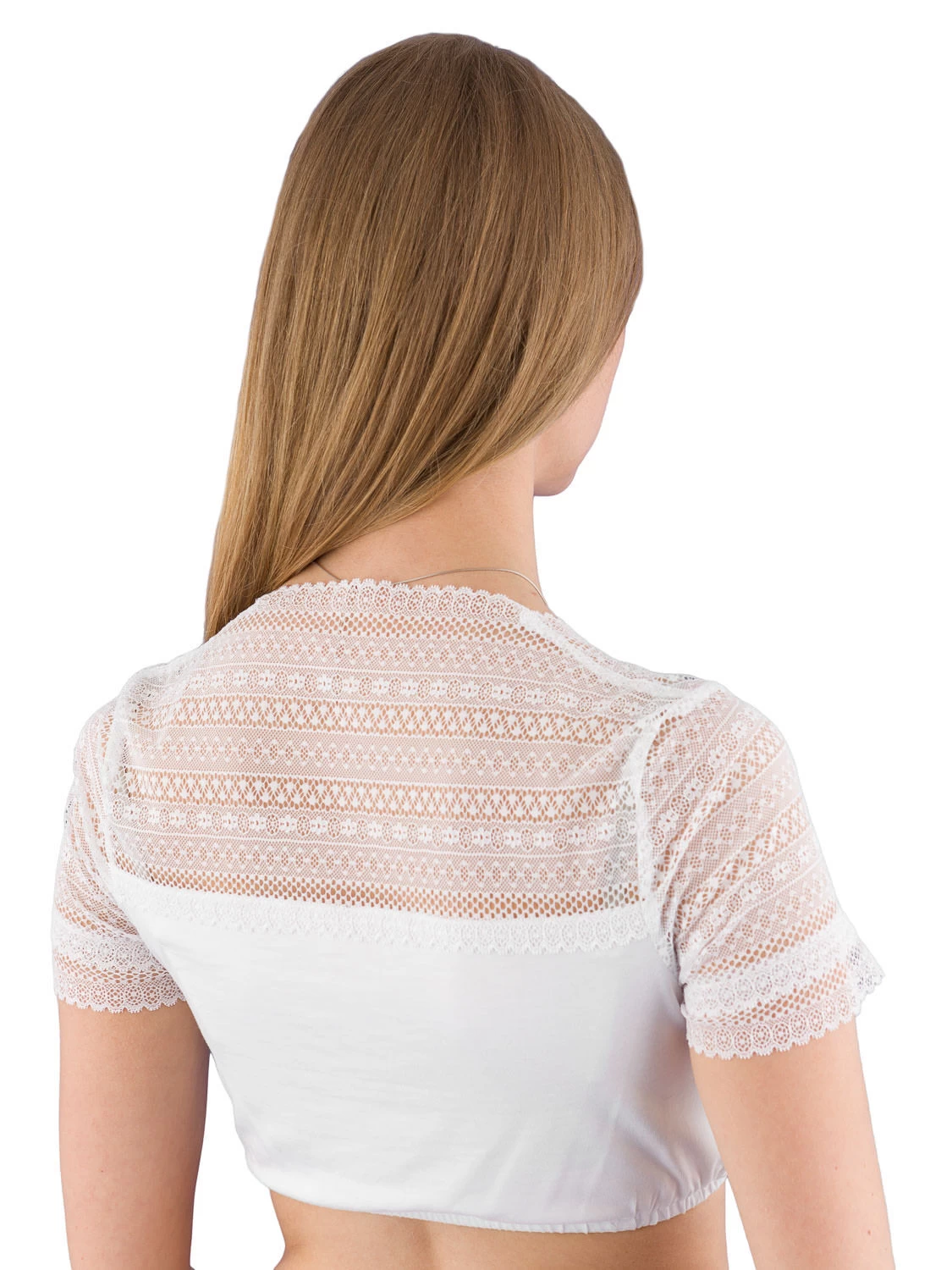 Romantische, hochwertige Dirndlbluse aus weicher, weißer Spitze vom Markenlabel Waldorff. Die Spitzenbluse trägt sich sehr angenehm, da die Spitzen sehr weich sind. Das Vorderteil ist unterfüttert. Der unter Rückenteil ist aus bequemen, elastischen Strecht gearbeitet. Die obere Rückenhälfte ist aus Spitze gearbeitet. Die schöne Dirndlbluse kann man vorne mitte raffen um ein zauberhaftes Dekolteè zu erziehlen. Das eleasische Unterbrustband sorgt zusätzlich für einen guten Sitz. Der Ausschnitt der Bluse ist für viele Dirndln geeignet.