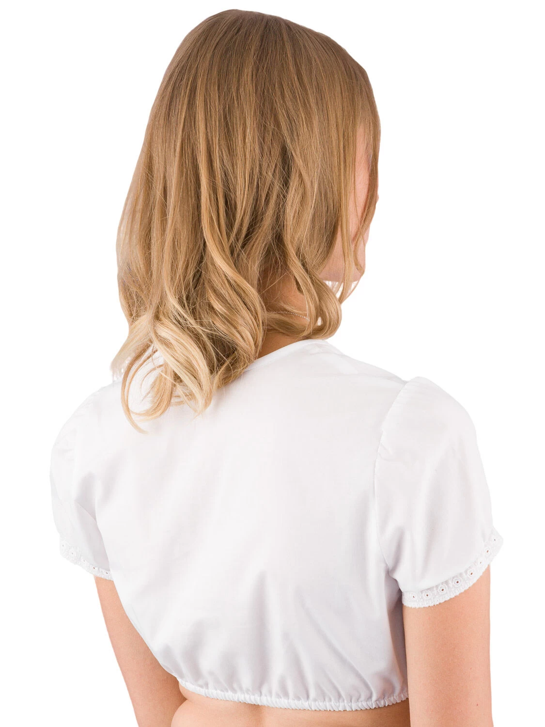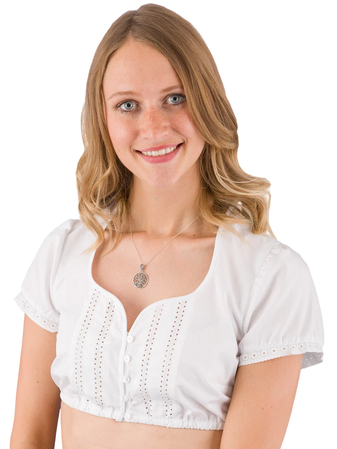 Dirndlbluse 0351 83 weiss der Marke Augenstern. Die Dirndl Bluse mit Herzausschnitt wird vorne geknöpft. Beidseitig sind am Vorderteil je 2 Loch Baumwollbordüren eingearbeitet. Am kurzen Ärmel befindet sich ebenfalls eine Baumwollbordüre als Abschluss.