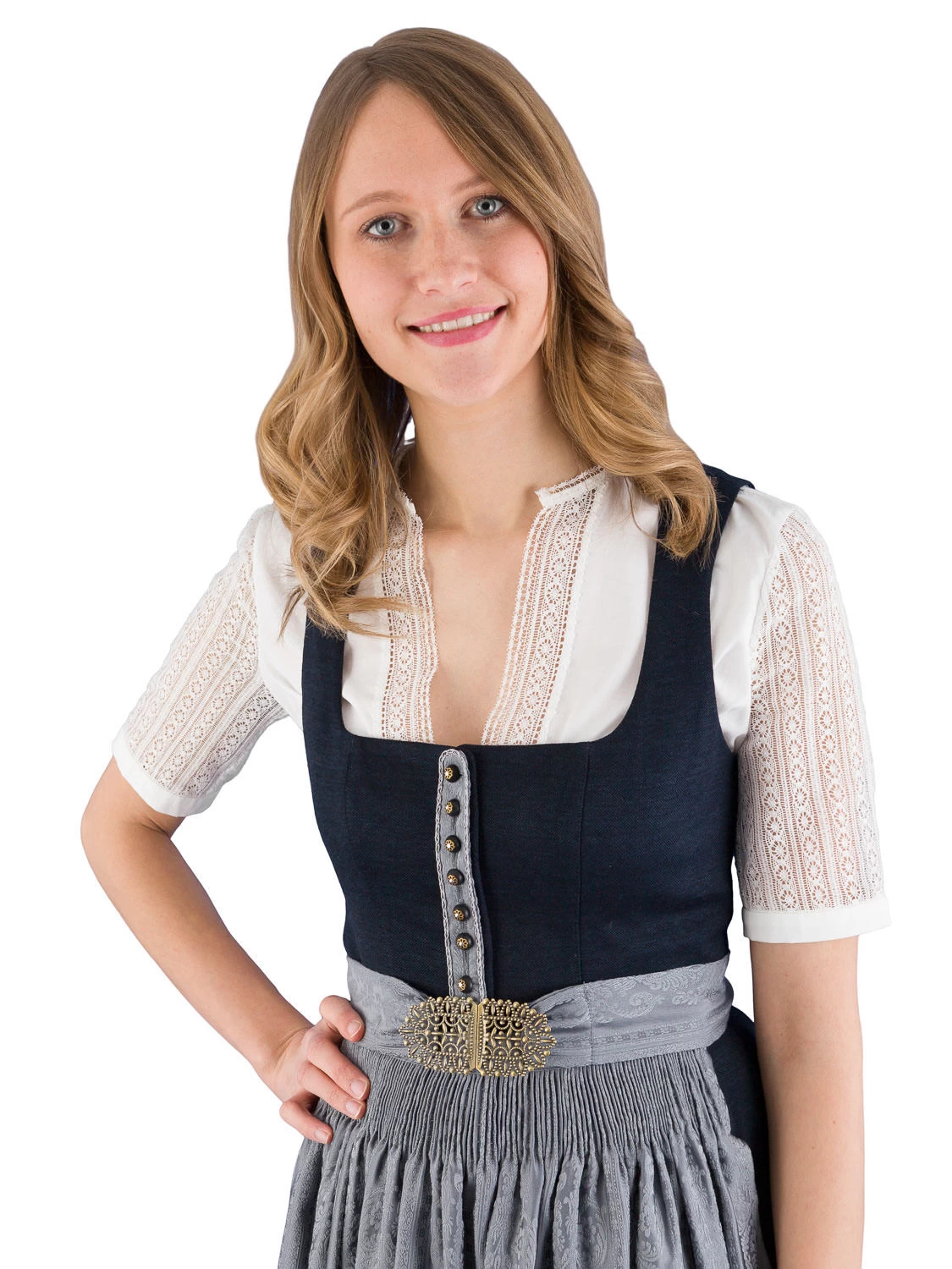 Hochwertige Dirndlschürze im edlen kieselgrau des Designer Label GOTTSEIDANK. Die Dirndlschürze ist 68 cm lang. Am hochwertige Baumwoll-Leinen Stoff ist einen Ton heller ein Rankenmuster längs eingewebt. Unter dem Bund ist die Schürze 5 cm breit gestiftelt. Die Trachtenschürze ist mit 2 verschiedenen Bändern zum Auswechseln ausgestattet. 1x für vorne zum Binden und die 2. Variante ist mit der für Gottseidank typischen SChnalle aus Messing. Mit dabei ist eine Knopfblende im Stoff der Schürze.