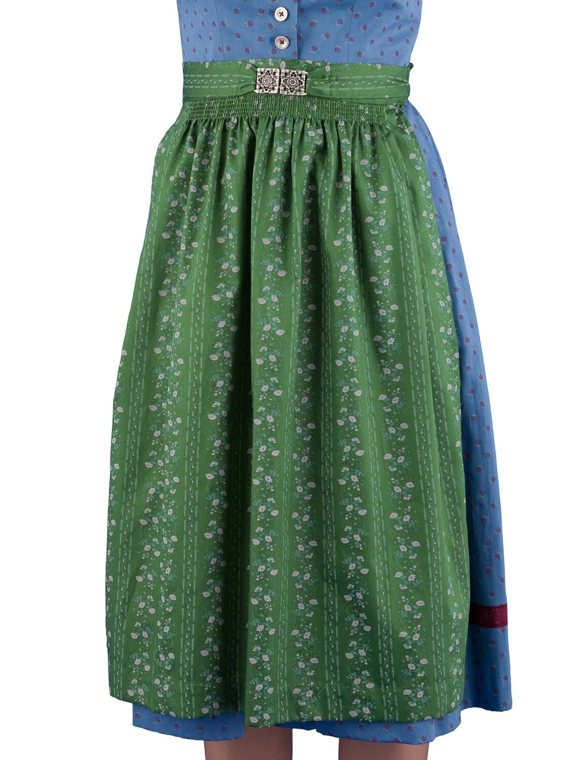Seidenmatt glänzende Baumwollschürze im schönen salbeigrün mit rose Blumen. Die Schürze von der Marke Turi wird mit einer schönen Altstilberspange geschossen. Für einen guten Sitz sorgt ein Gummizug im Schürzenband. Die Schürze hat eine Länge von 68 cm und passt daher perfekt für ein Dirndl in der Rocklänge 70 cm. Sie kann aber auch gut gekürzt werden.