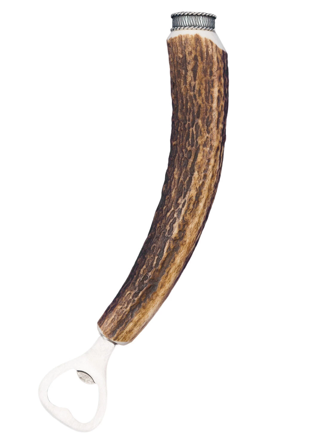 Flaschenöffner aus echtem Hirschhorn mit einer Altsilberkappe auf der das bayrische Wappen plastisch abgebildet ist. Der Öffner passt in das seitliche Messerfach der Lederhosen.