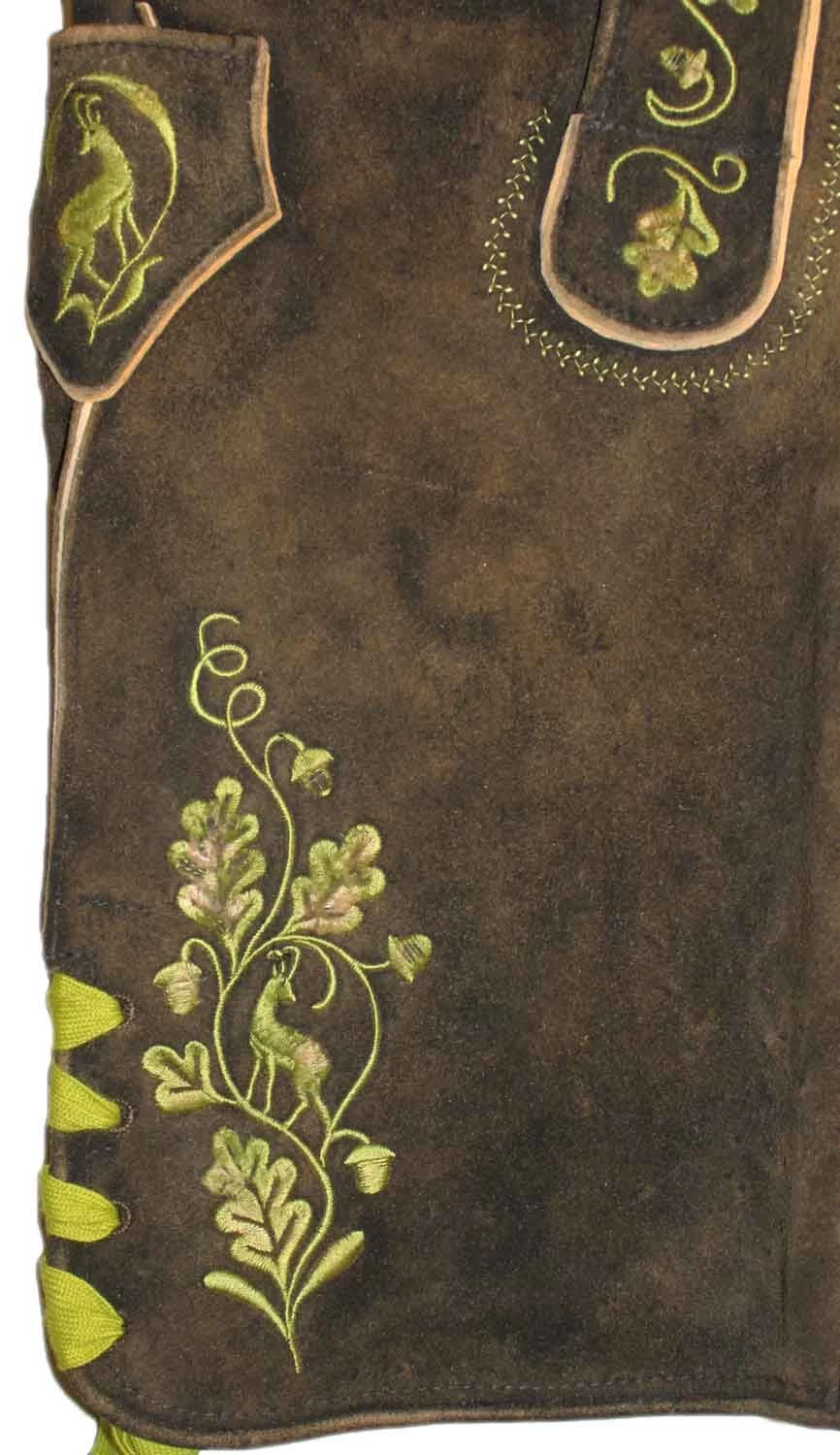 Die Farbe Ahorn dieser kurzen Lederhose kommt von Extrakten aus Baumrinden mittelamerikanischer Hölzer. Diese umwelt- und hautfreundliche Farbe wird mehrmals nur auf der Außenseite des Leders aufgetragen. Die weiche Innenseite der Lederhose zeigt die helle, natürliche Farbe, Resultat der sämischen Gerbung. Bei aller Liebe zur Tradition bleibt Meindl nicht in der Vergangenheit stecken. Dieser Name steht auch für Trachtenmode, die neue Wege geht. Beim Modell Herrenchiemsee zeigt das die Stickerei der Eichenmotive in Apfelgrün und Gelb. Breite, apfelgrüne Bänder verschnüren die Hosenbeine an der Seite – eine moderne Alternative zu den althergebrachten Hirschknöpfen oder der Schnürung aus Lederbändern. Eine Schnürung im Rücken macht es möglich, die Bundweite nach Bedarf zu regulieren.