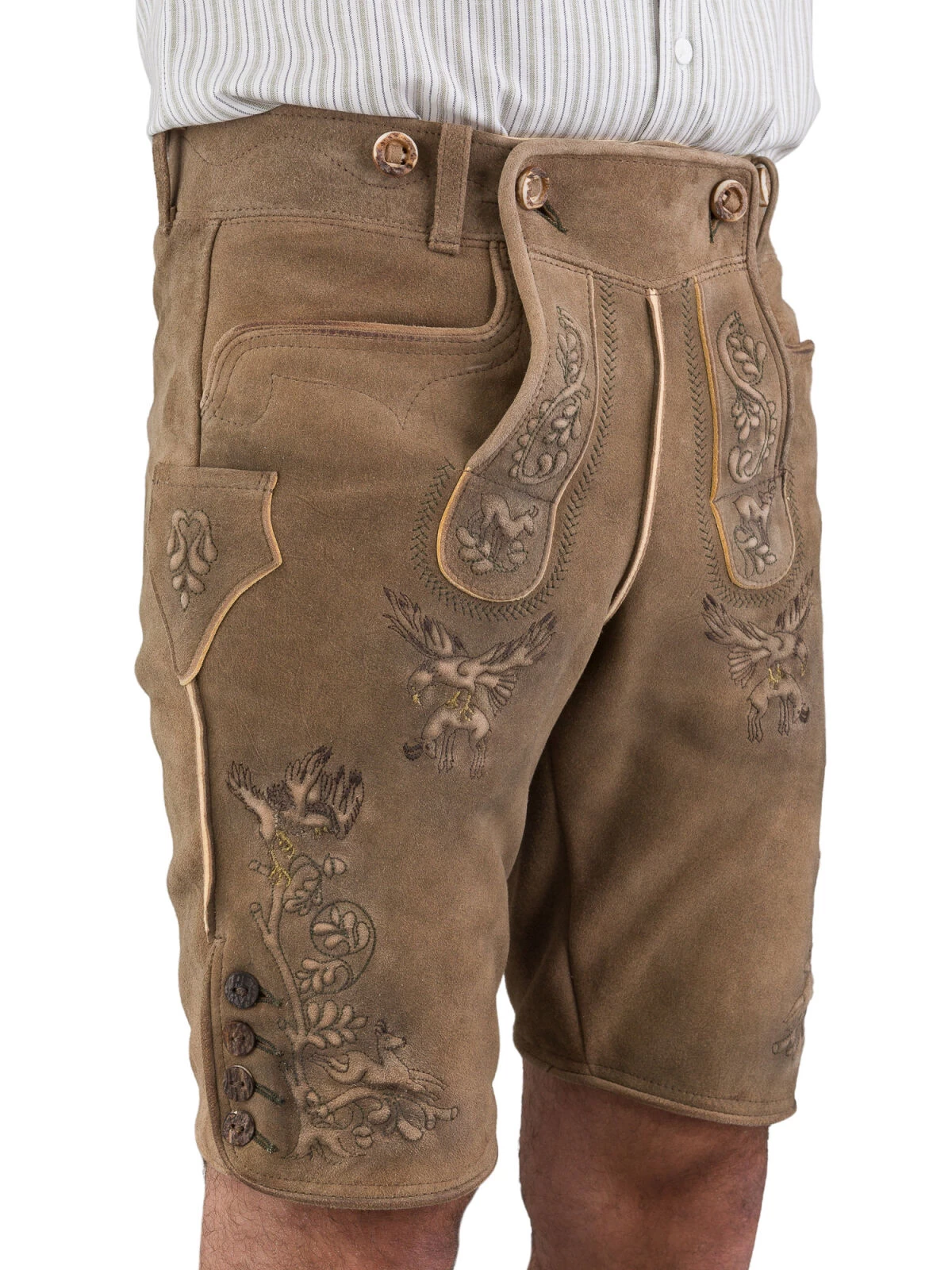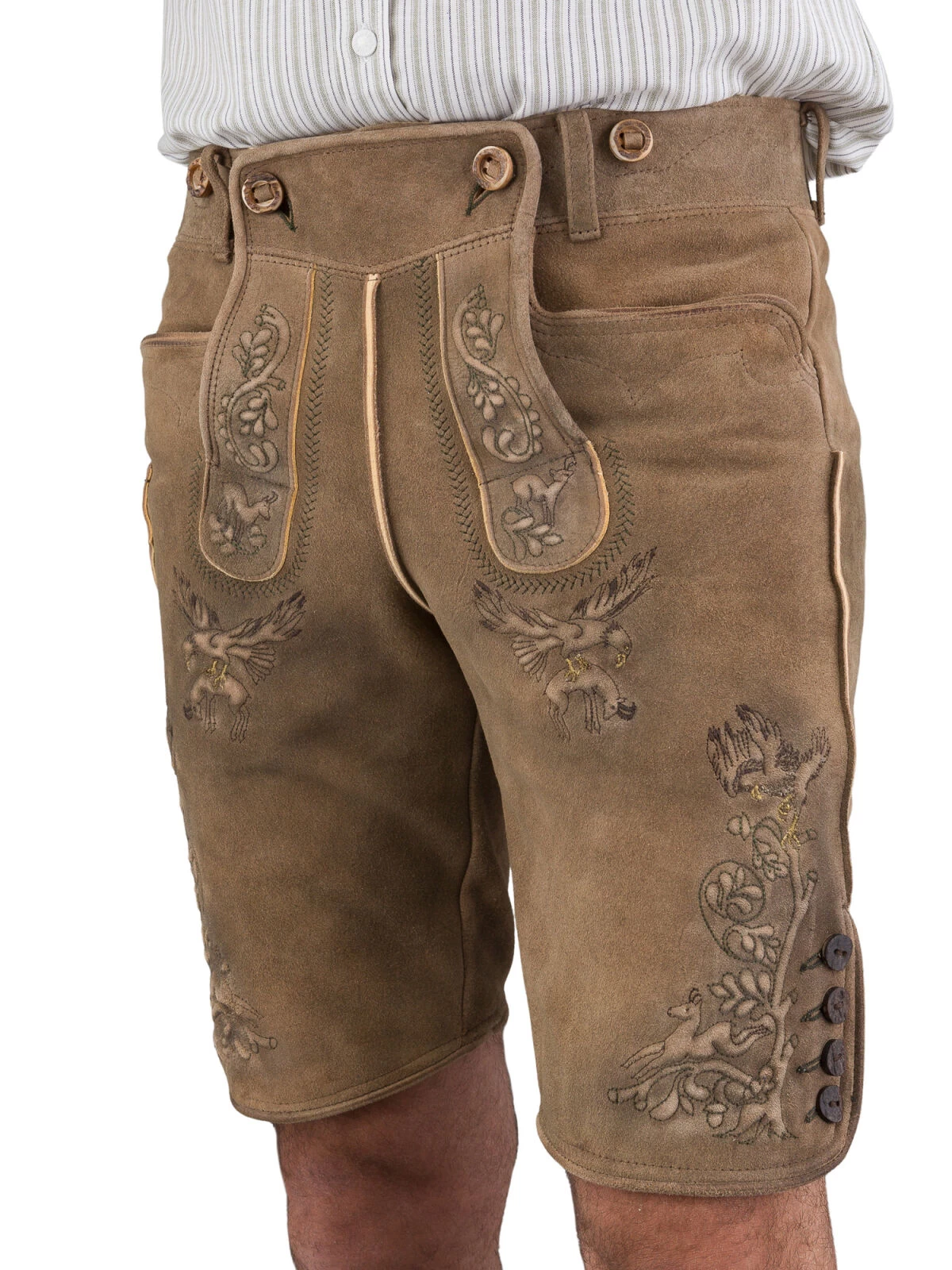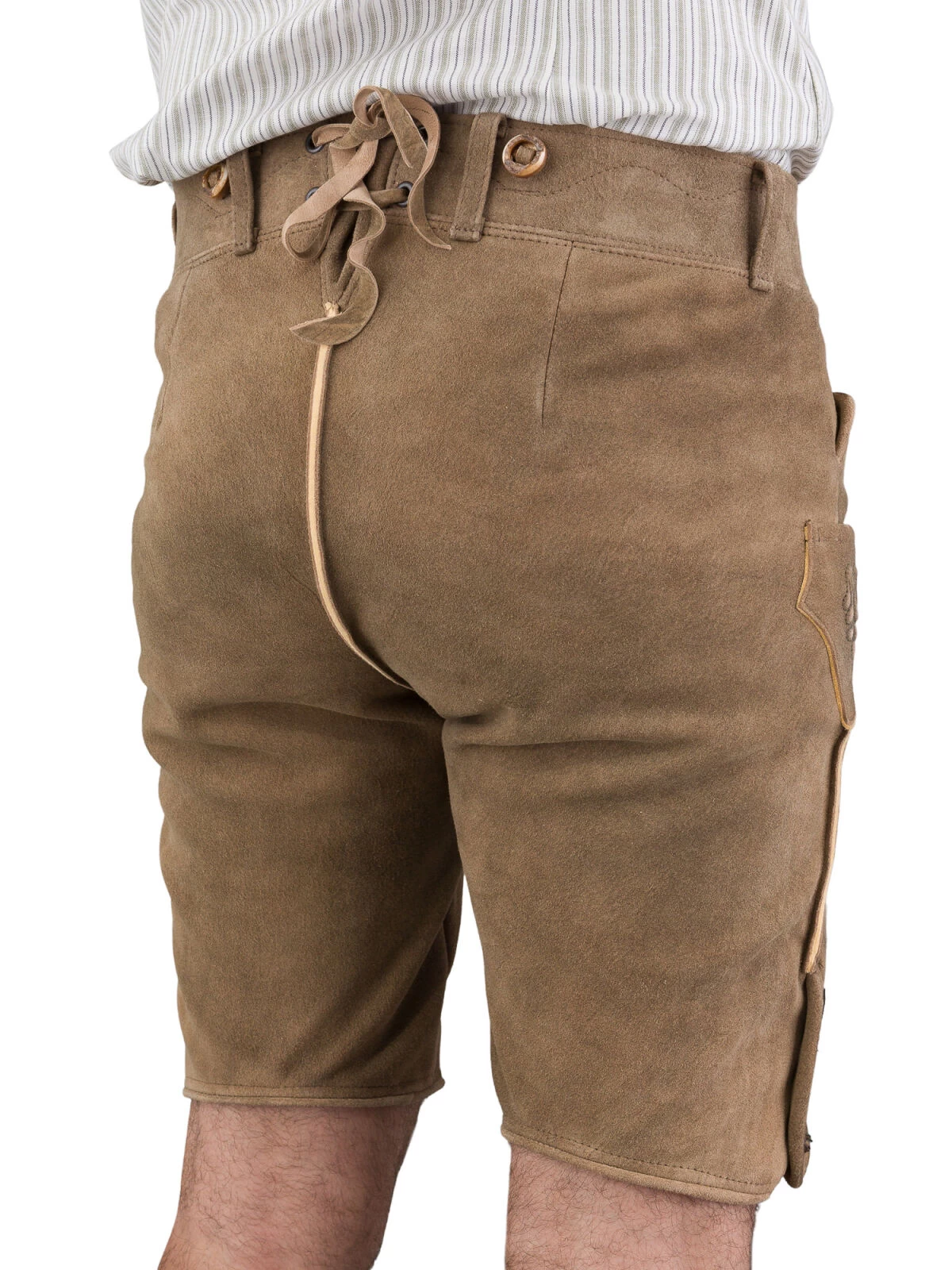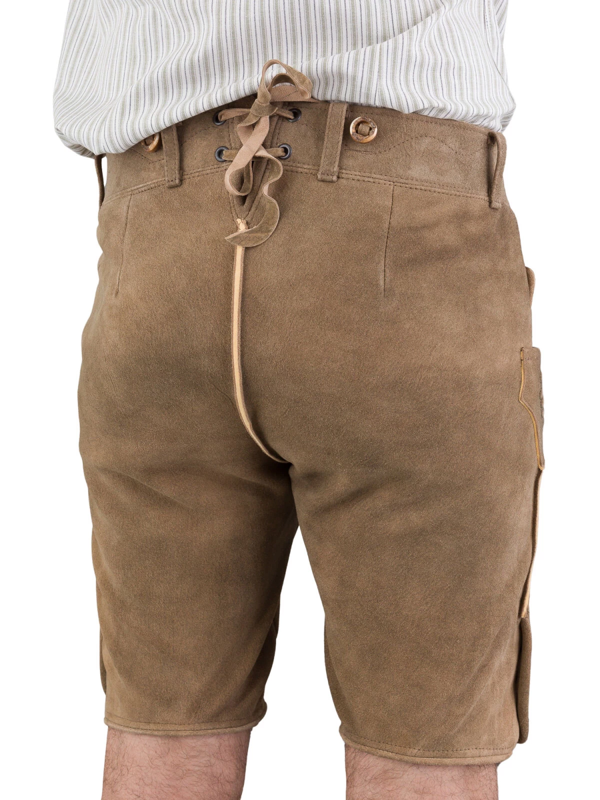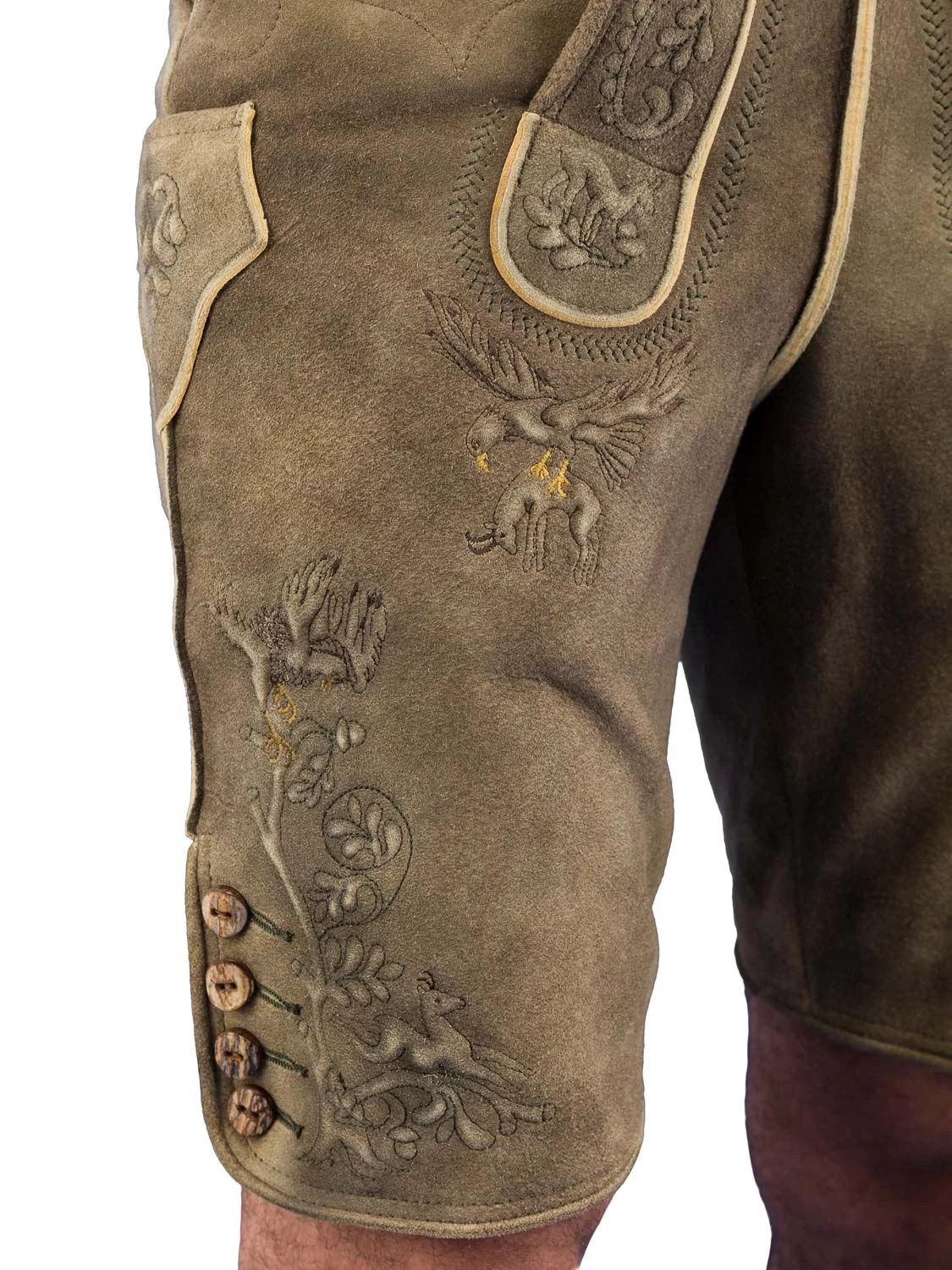 Hochwertige Ziegenvelours Lederhose Hohenwerfen in der Farbe inka. Die mit moosgrünen Stickfaden reichlich plastisch besticke Lederhose hat bei Gr. 48 eine Seitenlänge von 50 cm. Die Knöpfe am Bund sind echte Hirschhornknöpfe, die mit Lederbänder angenäht sind. Der Gürtel ist im Lieferumfang nicht enthalten. Am Bund hinten ist ein Riegel eingearbeitet, um die Bundweite zu regulieren.
