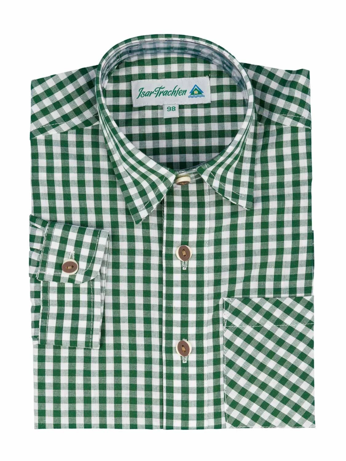 Kinder Trachtenhemd 52915 Karo tanne der Marke Isar Trachten. Das Baumwollhemd hat links eine Brusttasche aufgenäht.