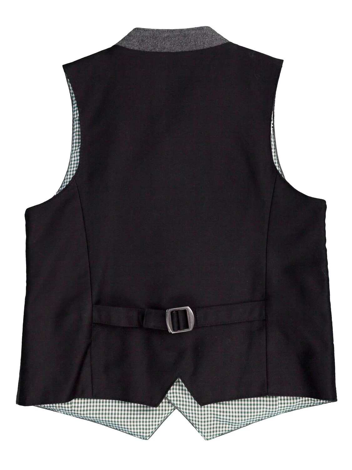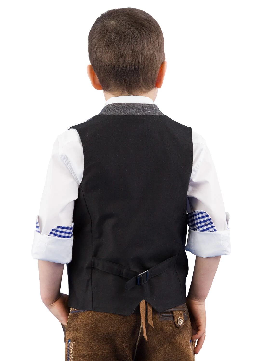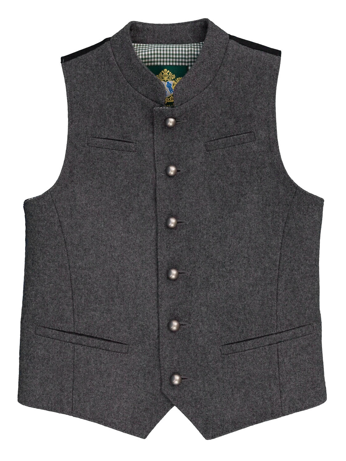 Kindertrachtenweste Maxi 61837 aus grauen Loden der Marke Hammerschmid. Der 2,5 cm hohe Stehkragen ist Ton in Ton bestickt. 4 Paspellierte Taschen zieren das Vorderteil. Der schwarze Baumwollrücken ist mit einem Riegel mit Spange versehen, um die Weite ein wenig zu regulieren.