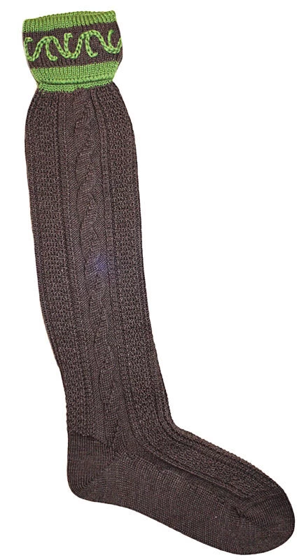 Wunderschöner Kniestrumpf L28995-1135 in braun apfelgrün der Marke Lusana. Am Strumpf sind jeweils zwei handgezogene Zöpfe. Der Umschlag mit apfelrünem Rand ist zusätzlich apfelgrün bestickt. Die Spitze ist hangekettelt. Der Strumpf ist Superwasch ausgerüstet. Dieser schöne Kniestrumpf ergänzt Ihre Lederhose mit einem zusätzlichen Blickfang!