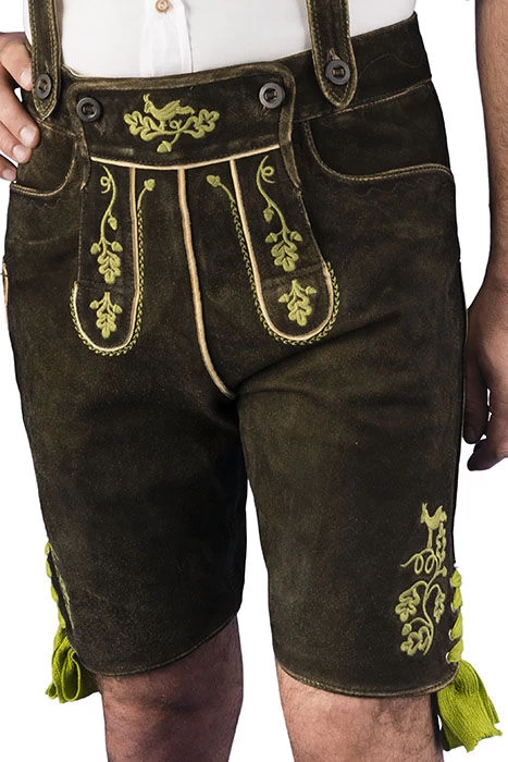Lederhose kurz Modell Laux in nougat der Marke Almsach. Die Lederhose ist aus weichem Ziegenvelours gefertigt. Die Lederhose ist im schönen grasgrün Blattbestickt. Am Bund hinten ist ein Riegel eingearbeitet, um die Bundweite zu regulieren. Rechts hinten ist eine Gesäßtasche eingearbeitet. Der Stegträger ist passend zur Hose bestickt. Am Beinende sind seitlich grüne Wollbänder angebracht. Seitliche Länge mit Bund 52 cm.