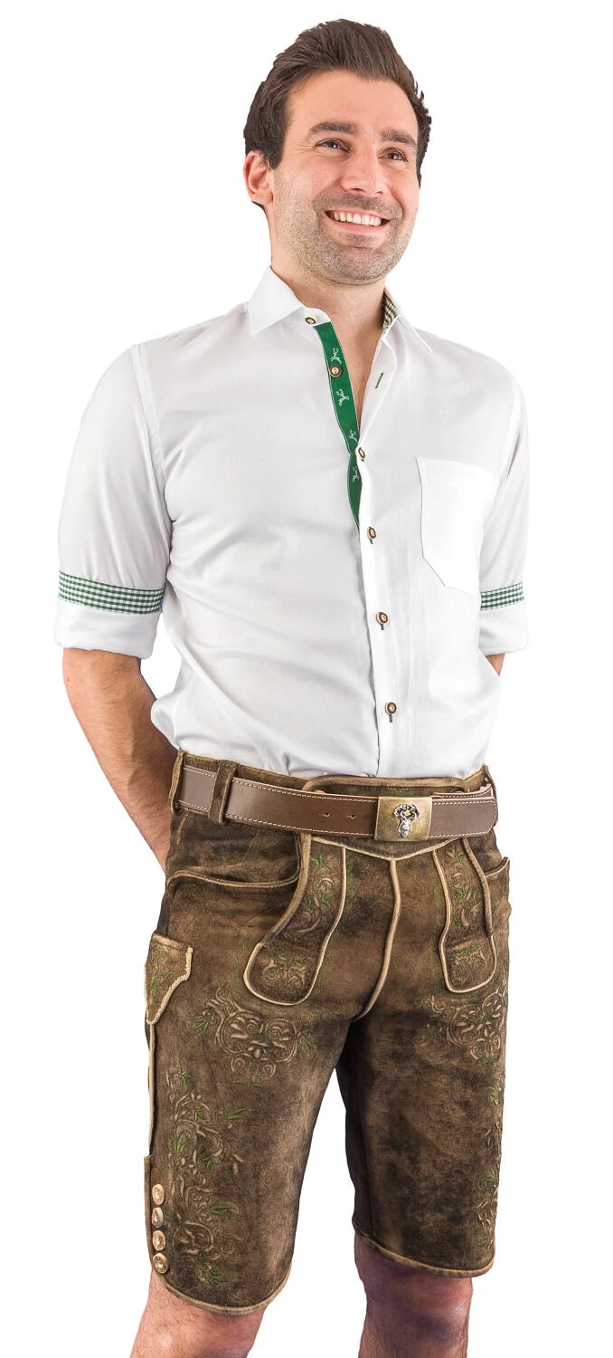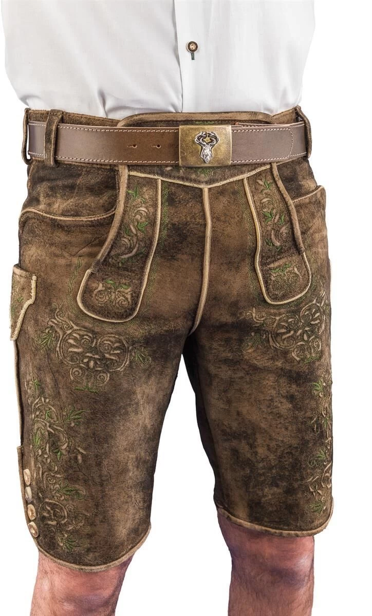 Trachtenlederhose Alpspitze mit Stegträger antik braun der Marke Maddox. Die plastisch grün bestickte Wildbocklederhose in Vintagelook misst eine Seitenlänge mit Bund von 52 cm. Am 5,5 cm breiten Bund befinden sich Gürtelschlaufen. Der Gürtel wird nicht mitgeliefert. (Art. 16383 kann bestellt werden). Rechts hinten befindet sich eine Gesäßtasche. An der linken Seitennaht ist eine Messertasche eingearbeitet.