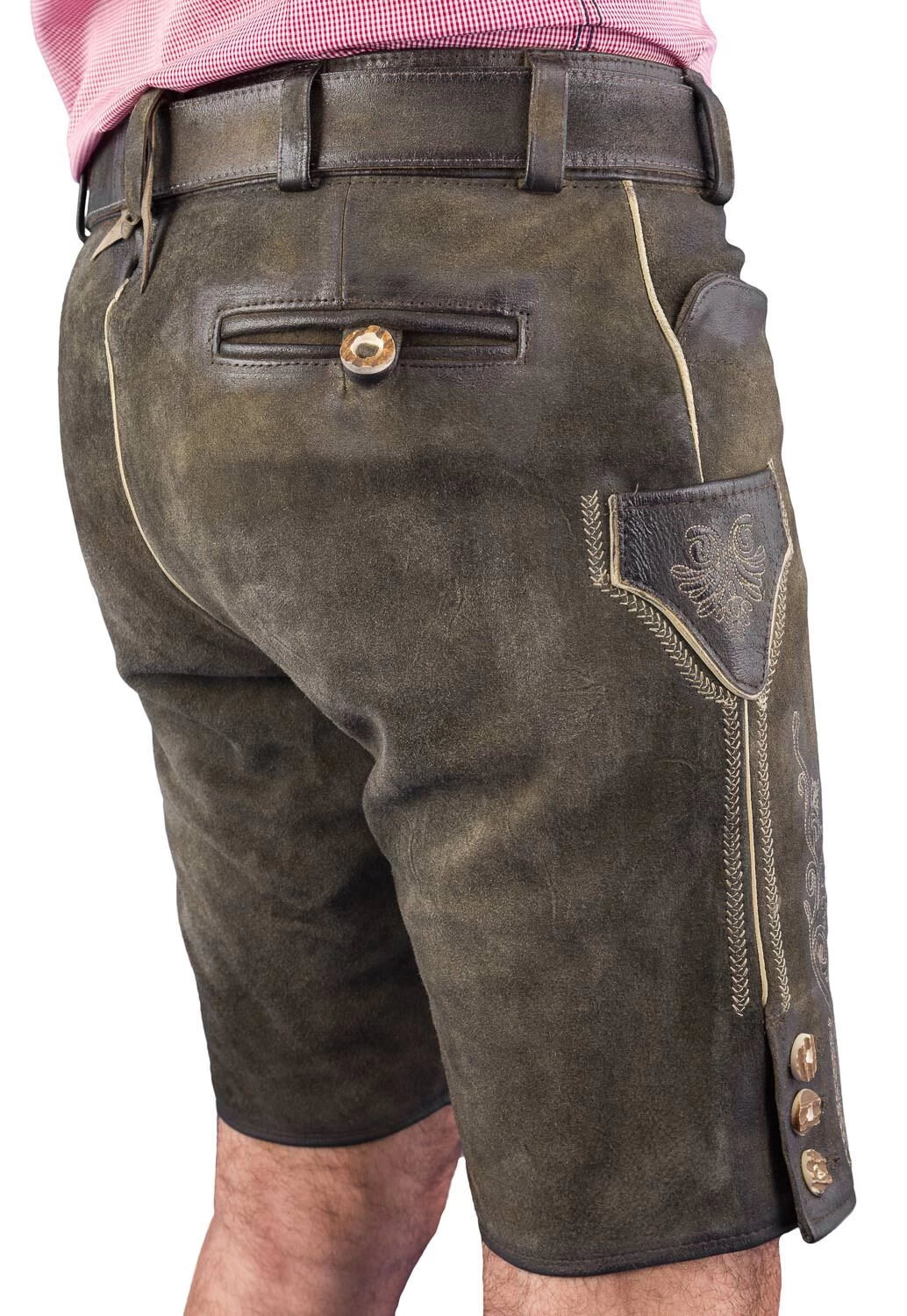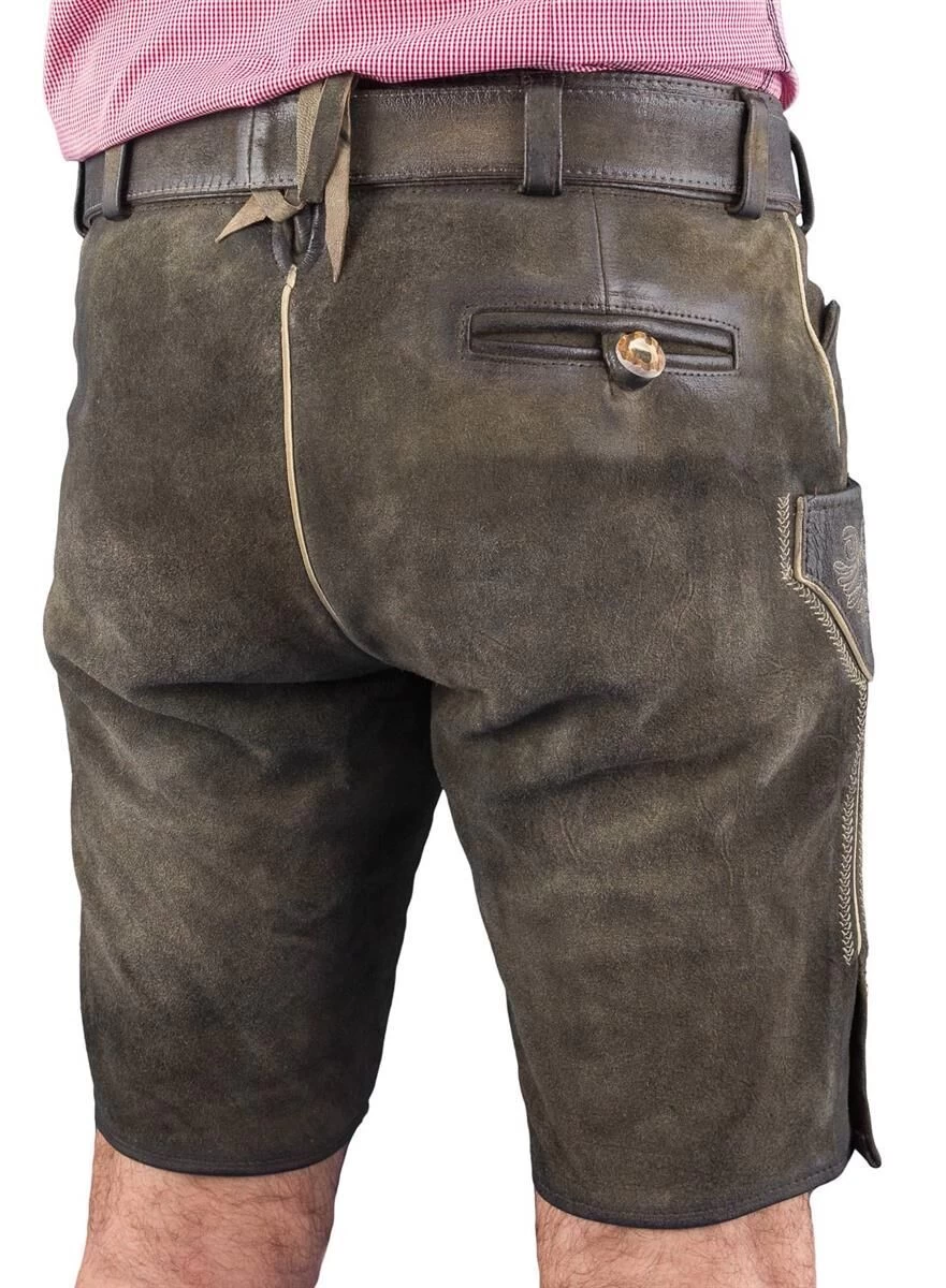 Kurze Lederhose Ammersee antik smoke der Marke Maddox. Die plastische Stickerei ist auf used gewachst. Der 4 cm breite Gürtel mit der Messingkoppel mit Bayernwappen wird mitgeliefert. Rechts hinten befindet sich eine Gesäßtasche mit Hirschhornknopf. Bei Gr. 48 beträgt die Seitenlänge mit Bund 48 cm.