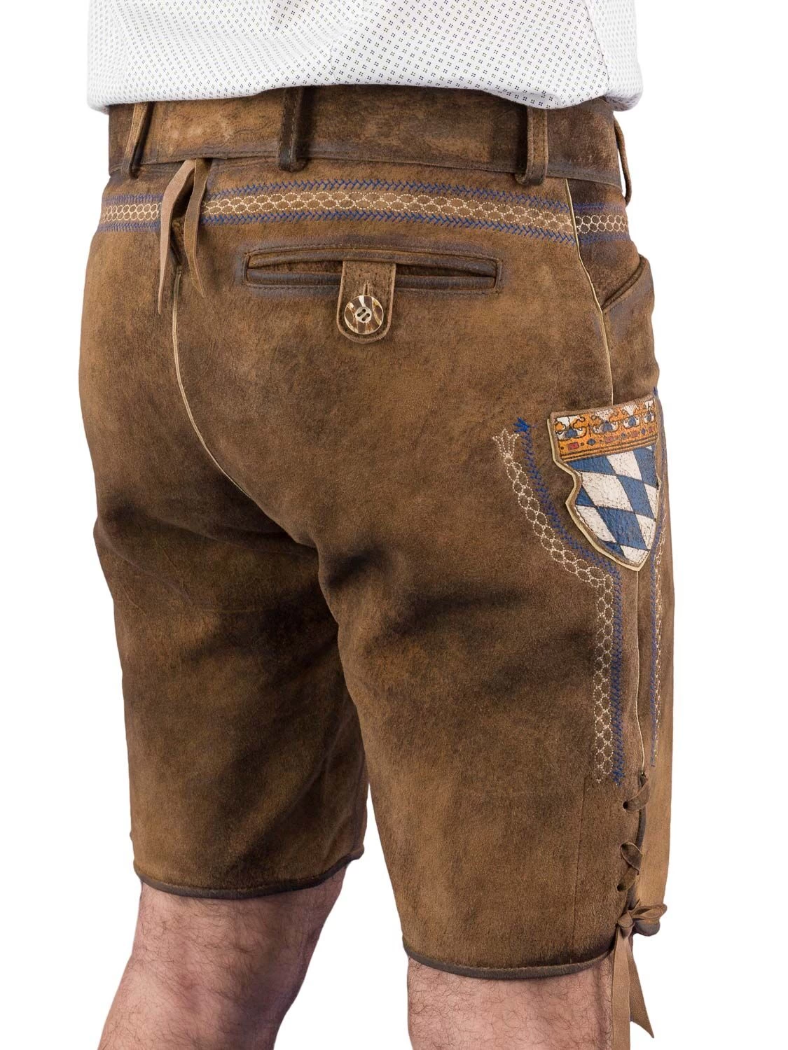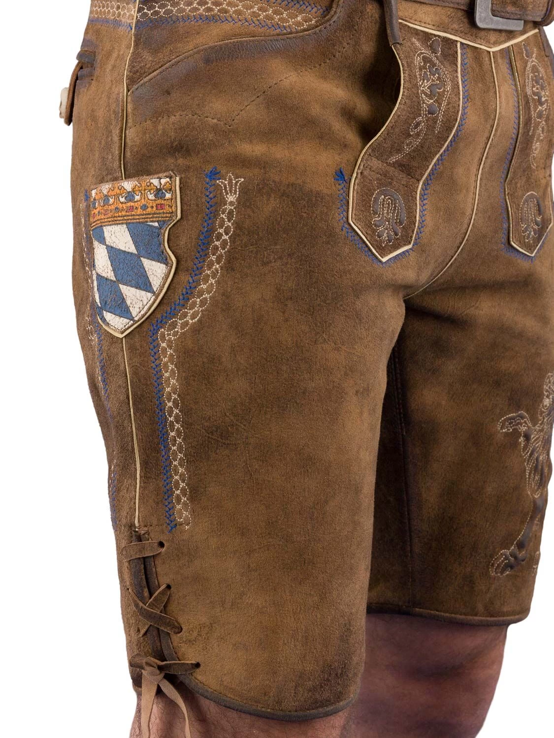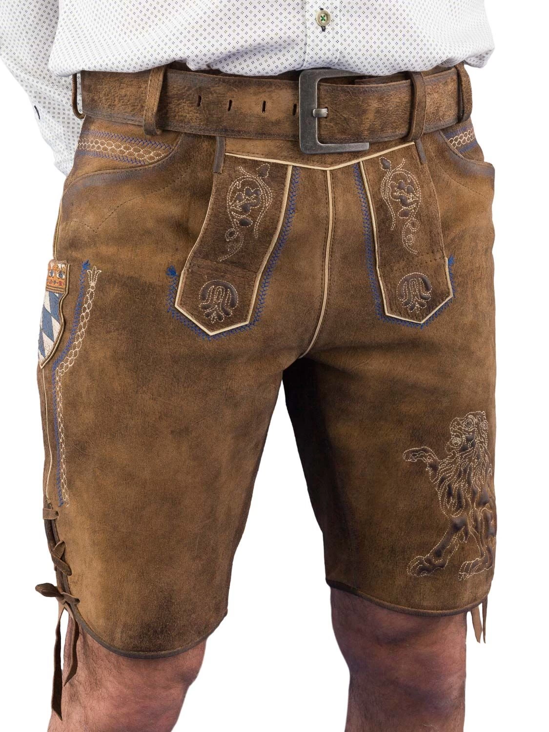 Trachtenlederhose kurz C-9573 khaki/blau der Marke Country Line. Die Lederhose besticht mit einer dezenten blauen Stickerei und die bayrische Raute an der Messertasche. Am Bein vorne links ist der bayrische Löwe plastisch beige gestickt. Der Gürtel wird mitgeliefert. Rechts hinten befindet sich eine Gesäßtasche. Die seitliche Länge mit Bund beträgt 50 cm. Die Taschen sind aus blau kariertem Stoff gefertigt.