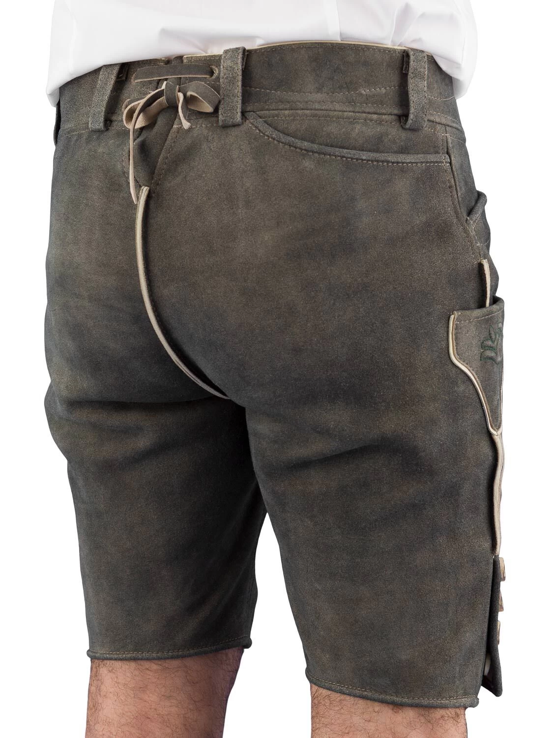 Kurze Lederhose aus echtem Wildbock Modell Ralf in der aktuellen Farbe schlamm von der Marke „Ledergott“. Die Lederhose in hochwertiger Säcklerarbeit besticht durch viele liebevolle Details. Die Marke „Ledergott“ ist im bayerischen blau im Bund eingestickt. Der markante Innenlatz ist ebenfalls mit dem Markenlabel bestickt. Zusätzlich ist am Innenlatz eine praktische rote Zip-Tasche. Die 3 Taschenbeutel sowie die Messertasche sind aus stabilen Leder gefertigt. Rechts hinten befindet sich eine Gesäßtasche. Am 5 cm breiten Bund sind Gürtelschlaufen angebracht. Hinten am Bund ist ein Riegel eingenäht, um die Bundweite zu regulieren. Die Lederhose im aktuellen grauton ist grünt plastisch bestickt. Den Beinabschluss zieren jeweils 4 Echthornknöpfe. Die schöne Lederhose hat eine sehr gute Paßform. Bitte beachten Sie beim Kauf, dass die Lederhose sehr knapp sitzen soll, da das Leder sich mit der Zeit noch weitet.