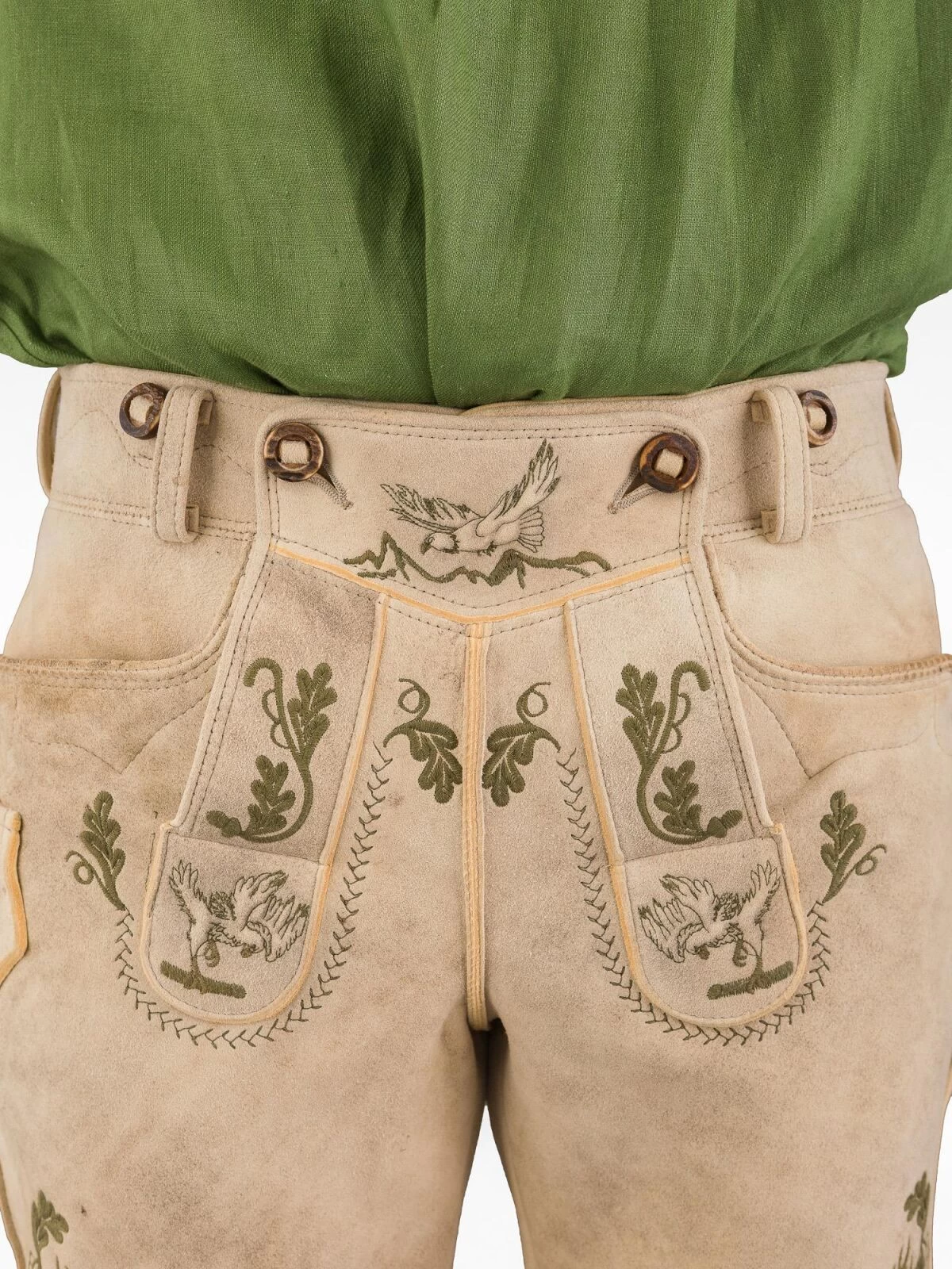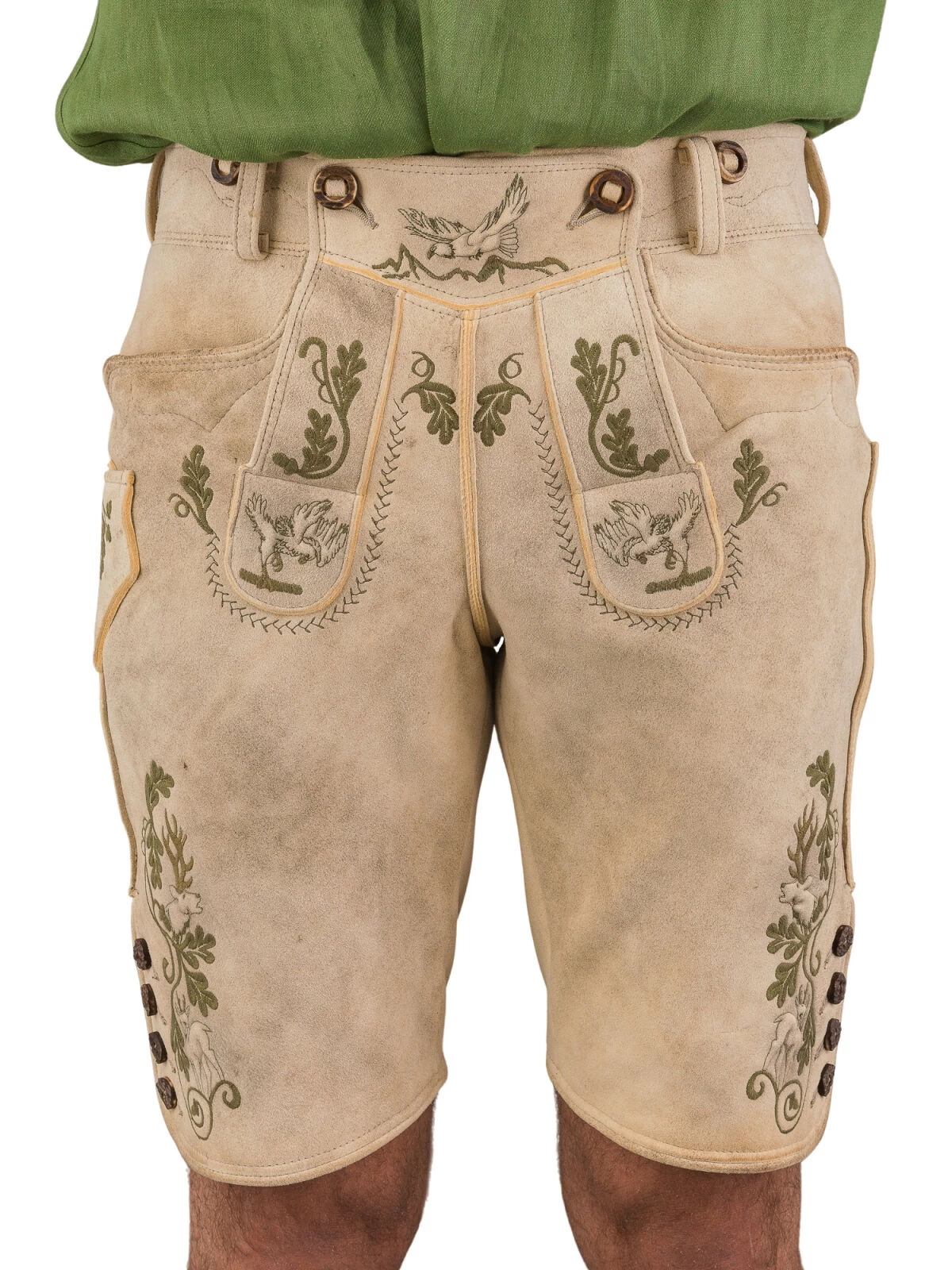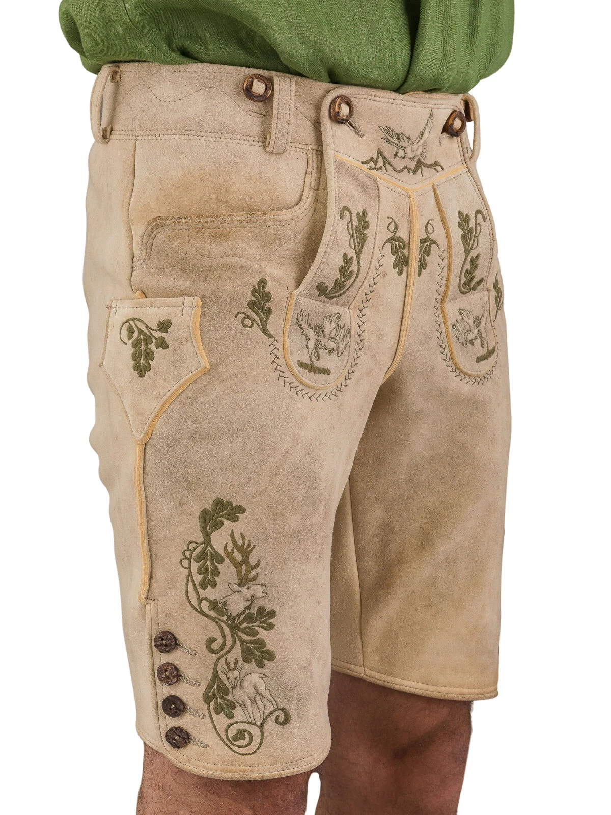 Die Hose passt perfekt zu einer Vielzahl von Trachten-Outfits. Der Beinabschluss ist mit echten Hirschhornknöpfen versehen. Die seitliche Länge beträgt 50 cm bei Größe 46, was die ideale Länge für das authentische Trachtengefühl ist.