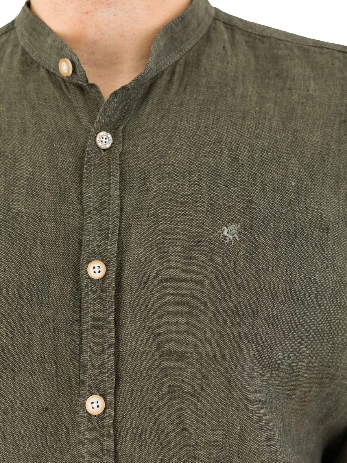 Hochwertiges Leinenhemd mit Stehkragen Casual fit im modischen grün. Leinen ist sehr atmungsaktiv und trägt sich im Sommer super auf der Haut. Der aktuelle Stehkragen gibt dem Hemd eine eigene Note. An der Brust befindet sich eine Stickerei.