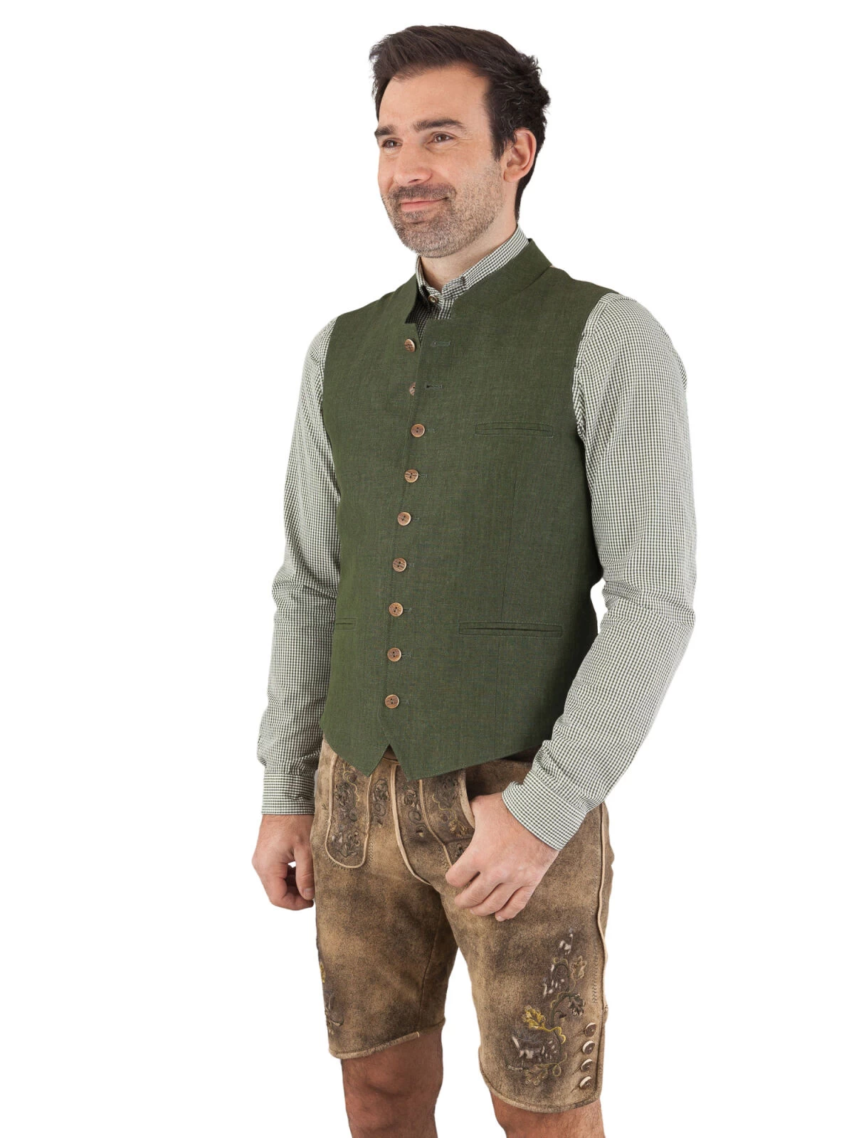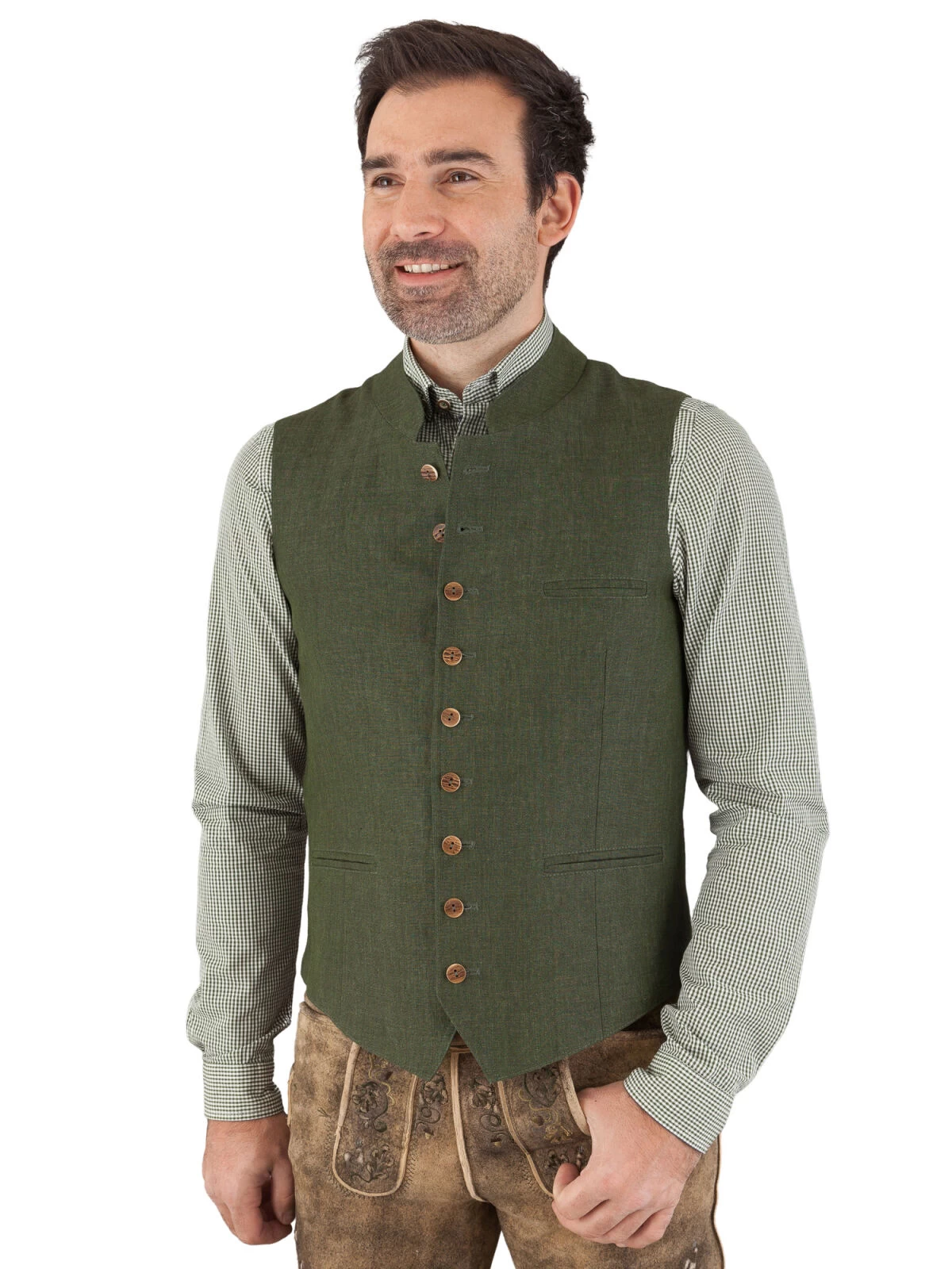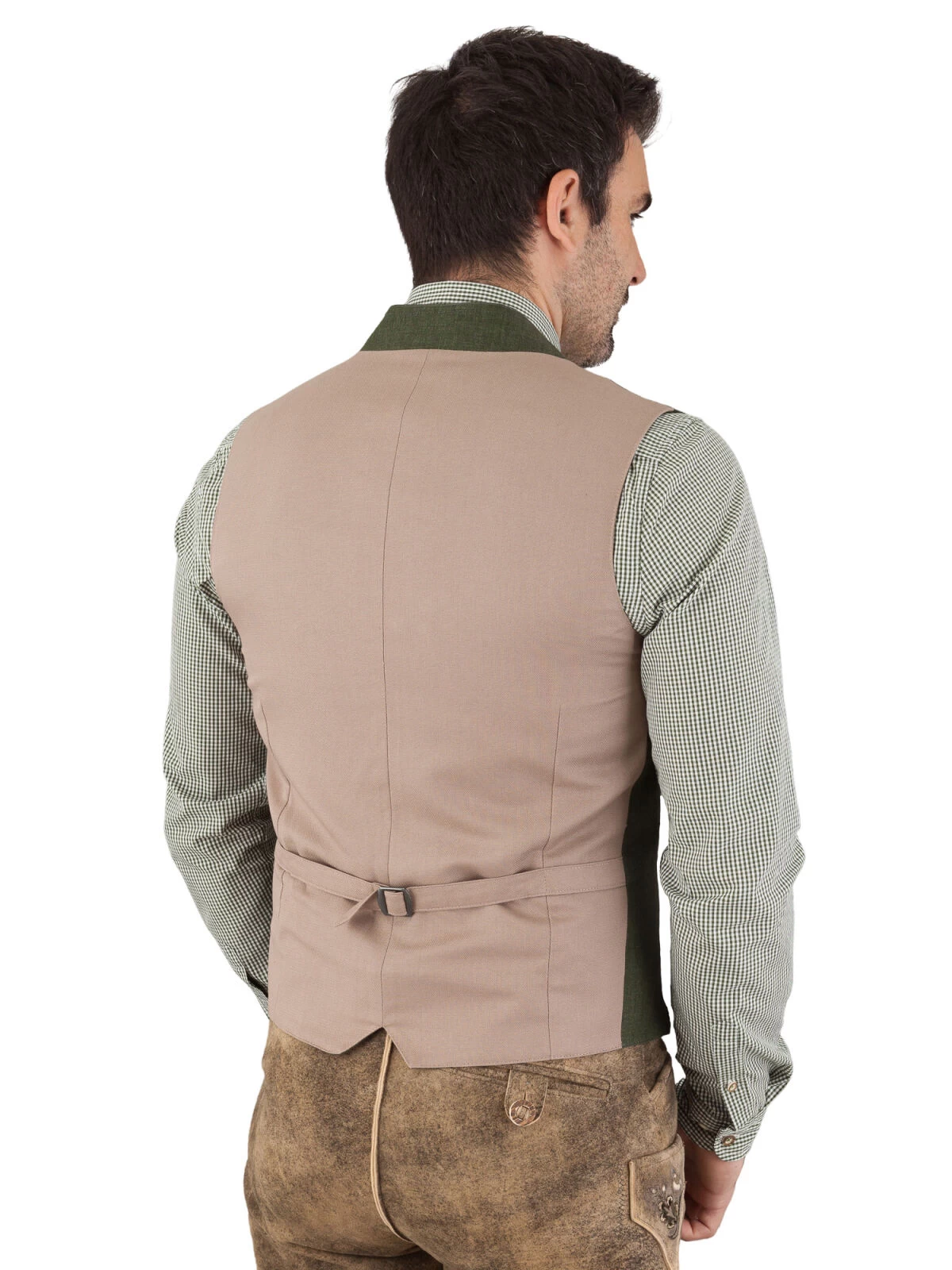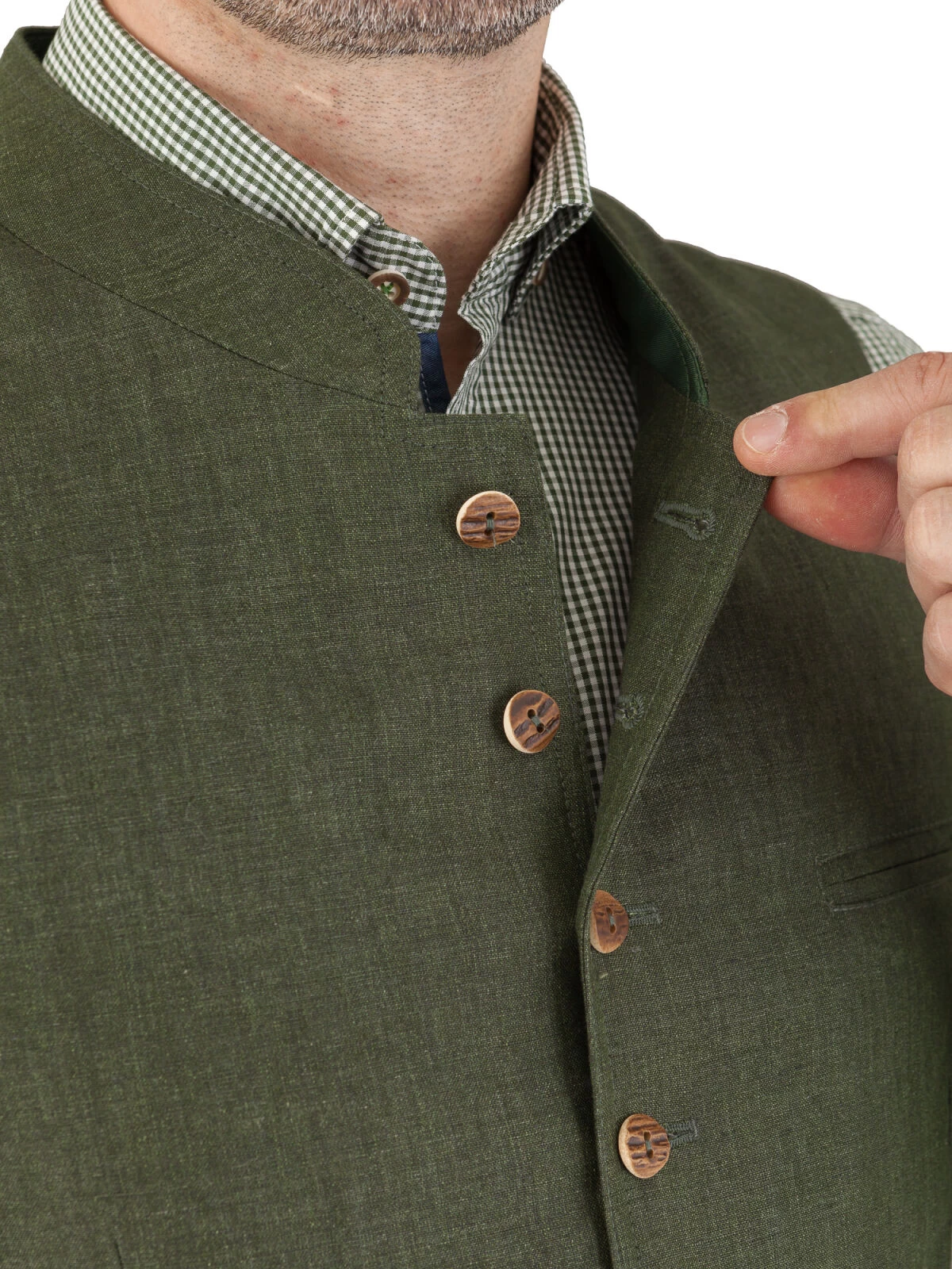 Der beigefarbene Rückenstoff setzt einen subtilen Kontrast zur Hauptfarbe Moosgrün und betont die Detailverliebtheit, die in die Schaffung dieser Weste eingeflossen ist. Ein besonderes Highlight sind die Knöpfe in Hirschhornoptik – ein klassisches Element, das eine unverwechselbare rustikale Note verleiht.