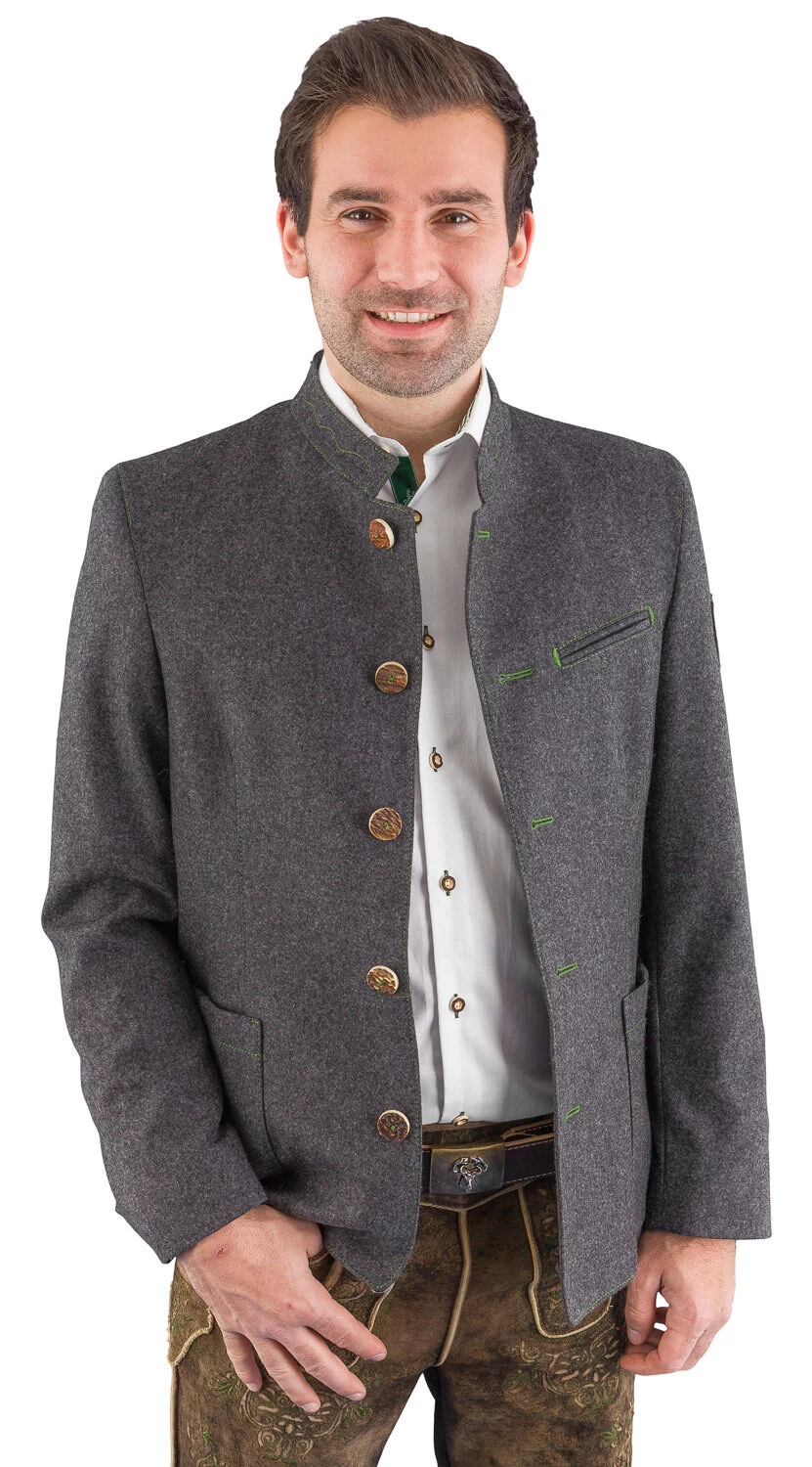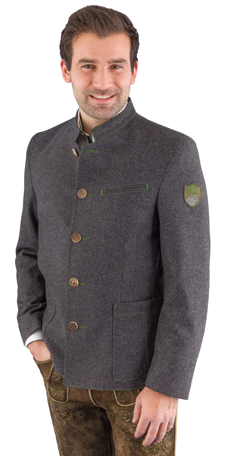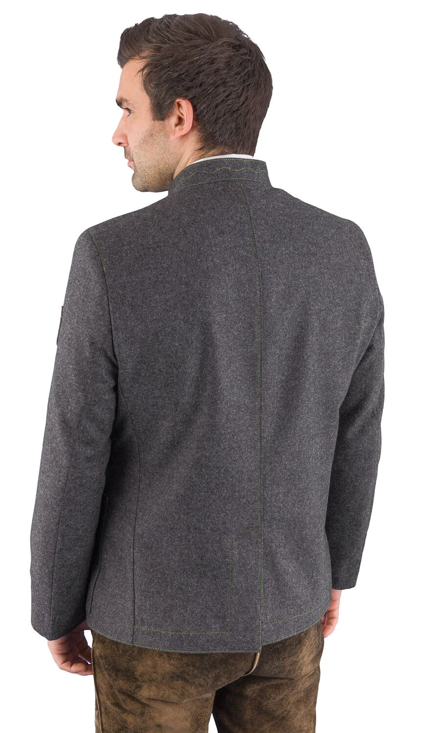 Schlanke Lodenjoppe Amadeus 3217 in der Farbe 12 grau. Der bayrische Leichtloden ist von der Marke Mehler. Die sportive Trachtenjacke hat aufgesetzte Taschen, Stehkragen mit Wellenstepp, Chiemgauer Stick an der Brusttasche. Die Kontraststeppnähte sind im aktuellen Säcklergrün. Die Lodenjacke wird mit Hirschhornknöpfen geknöpft. Das Futter ist ein helles Baumwollfutter. Die Jacke ist mit 3 Innentaschen ausgestattet. Die Rückenlänge bei Gr. 48 beträgt 70 cm.