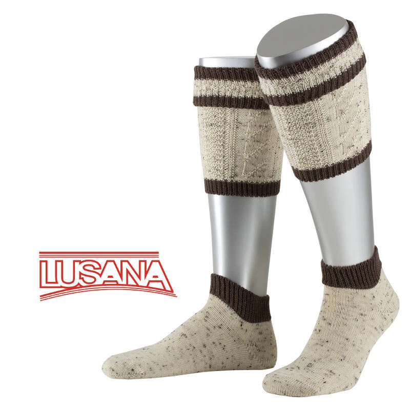 Urig-traditioneller Trachten Loferl Art. L479T-011 in beige meliert, braun der Marke Lusana. Der Loferl ist ein wahrer Blickfang für Herren, die zu jeder Lederhose passt und eine gute Alternative zum herkömmlichen Trachtenstrumpf bietet. Der Loferl besteht aus Füßling und Wadenstrumpf. Der Wadenstrumpf hat oben einen Umschlag in braun beige und ist mit einem schönen Zopfmuster gestrickt. Der Loferl bietet perfekten Halt an der Wade durch Zugabe von Lykra an den Bündchen. Sie rutschen nicht und schnüren auch nicht ein. Er bietet hohen Tragekomfort und Langlebigkeit durch Fersen- und Spitzenverstärkung. Die Spitze ist handgekettelt.