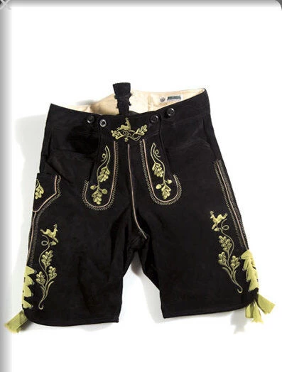 Von der Verarbeitung her unterscheidet sich diese Lederhose nicht von den Premium-Modellen der Firma Meindl in Hirschleder. Die Motive der gelben Plattstickerei zieren seit Jahrhunderten Lederhosen im Alpenraum. Die Ranken mit Eichenlaub und der springende Hirsch kontrastieren mit dem Schwarz des Rauleders. Eine Schnürung am Bund erlaubt es, die Weite zu verändern. Mit gelben Bindebändern können Sie auch die Weite der Hosenbeine regulieren. Mit dieser Lederhose platteln Sie nicht nur zünftig, Sie machen in ihr auch am Biertisch und bei der Jagd eine prächtige Figur.