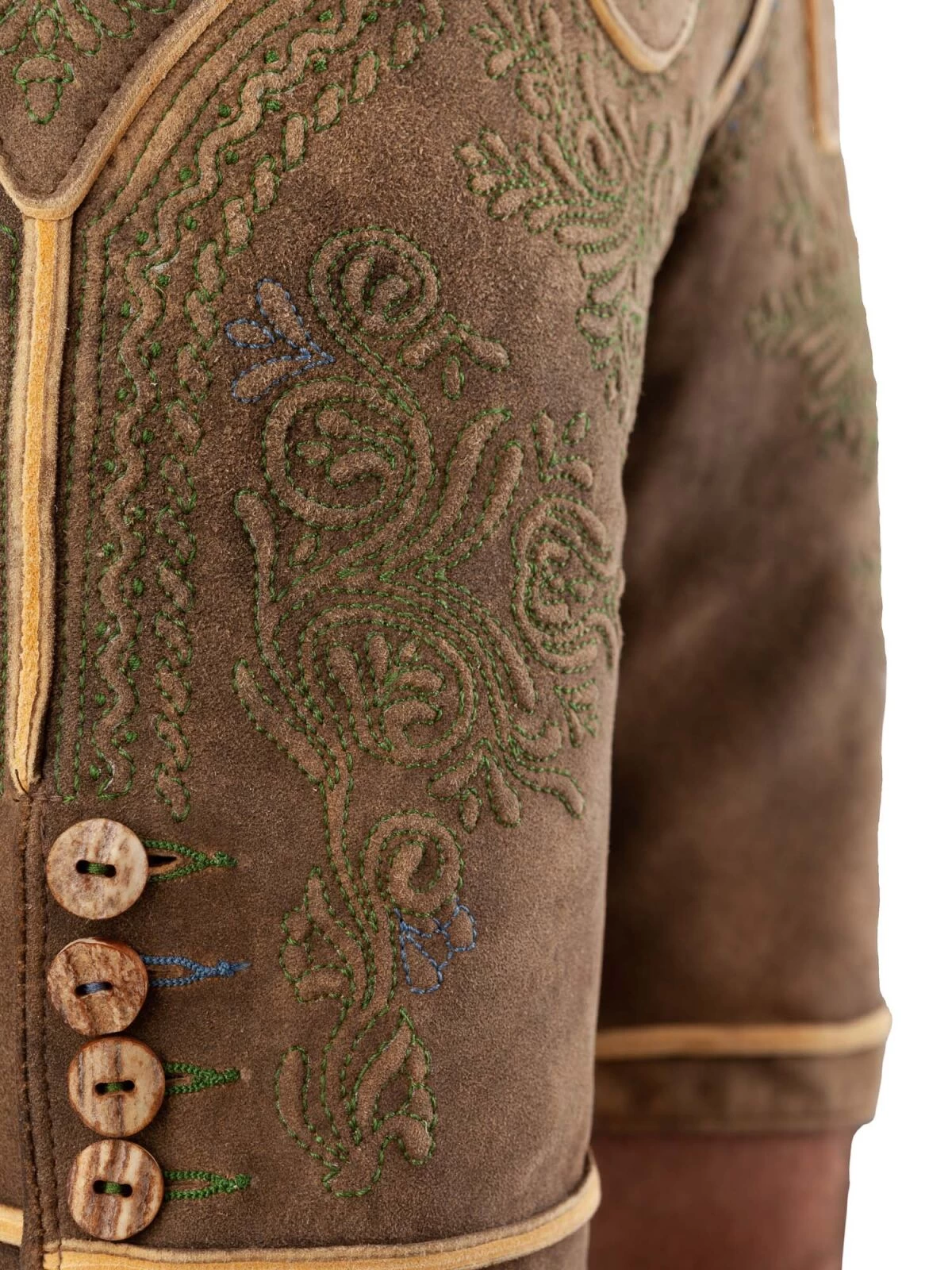 Die Kaiser Franz Hirschlederhose von Meindl ist der Rolls Royce unter den Lederhosen. Fast 60 Stunden Handarbeit machen diese Hose zu einem einzigartigen Kunstwerk. Die plastische Stickerei wird mit einem grasgrünen Faden per Hand gestickt. Ein Knopfloch am Bein sowie einige Stellen von der Reliefstickerei sind mit einem blauen Faden gestickt. Diese exclusive Hirschlederhose zu tragen ist fast schon ein Privileg, da sie immer nur in einer ganz begrenzten Stückzahl gefertigt werden kann. Diese Hose auf der Haut zu spüren ist ein unbeschreibliches Gefühl. Besonders schön und aktuell wirkt diese wunderbare Lederhose in der Farbe altschwarz. Die Rothirschhaut ist sämisch gegerbt. Durch diese Gerbung tragen Sie keine Chemie auf der Haut. Die Farbe altschwarz, die aus Holzextrakten gewonnen wird, wird mit viel Gefühl mehrmals aufgetragen, um einen schönen natürlichen Effekt zu erziehlen. Die Knöpfe sind echte Hirschhornknöpfe. Am 5 cm breiten Bund sind Gürtelschlaufen angebracht. Hinten am Bund ist ein Riegel eingearbeitet, um die Bundweite zu regulieren. Bei Gr. 48 beträgt die seitliche Länge mit Bund 50 cm. Diese Lederhose wird, wie jede Hirschlederhose, beim Tragen um eine Größe weiter. Deshalb soll sie am Anfang sehr knapp sitzen. Bei Fragen dürfen Sie uns gerne auch telefonisch kontaktieren.
