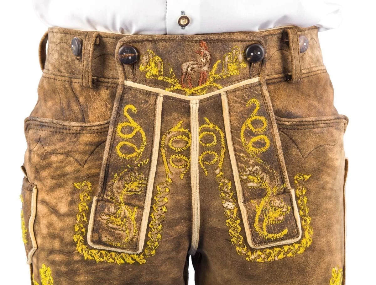 Ebenso sorgfältig werden die Lederhosen genäht und mit Stickerei verziert. Die Säcklernähte zeigen das Innere der Häute. Das betont nicht nur die Form der Lederhose und damit des Körpers, sondern ist auch ein Zeichen von bester Qualität. Die echten Hirschhornknöpfe, die seitlichen Bindebänder in der Farbe der Stickerei und die Schnürung im Rücken sind traditionelle Details, die eine ordentliche Lederhose auszeichnen. Mit diesem Modell treffen Sie eine gute Wahl, die Ihnen anerkennende Blicke einbringen wird.
