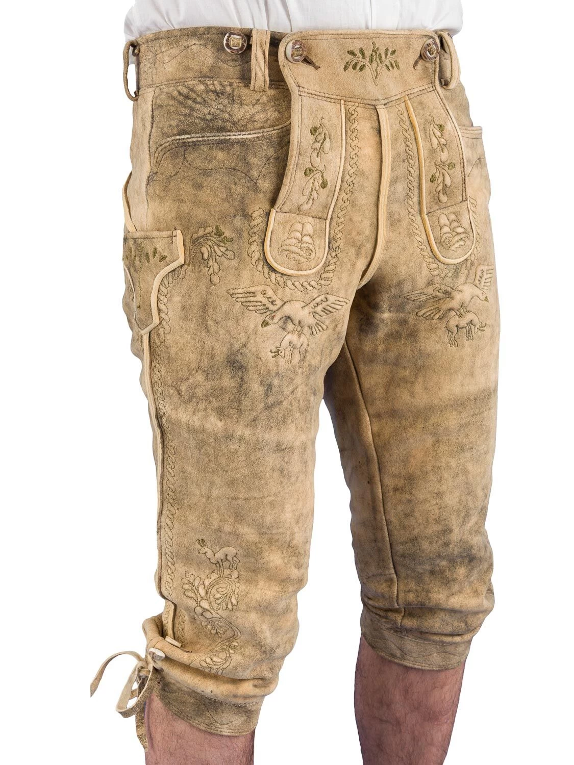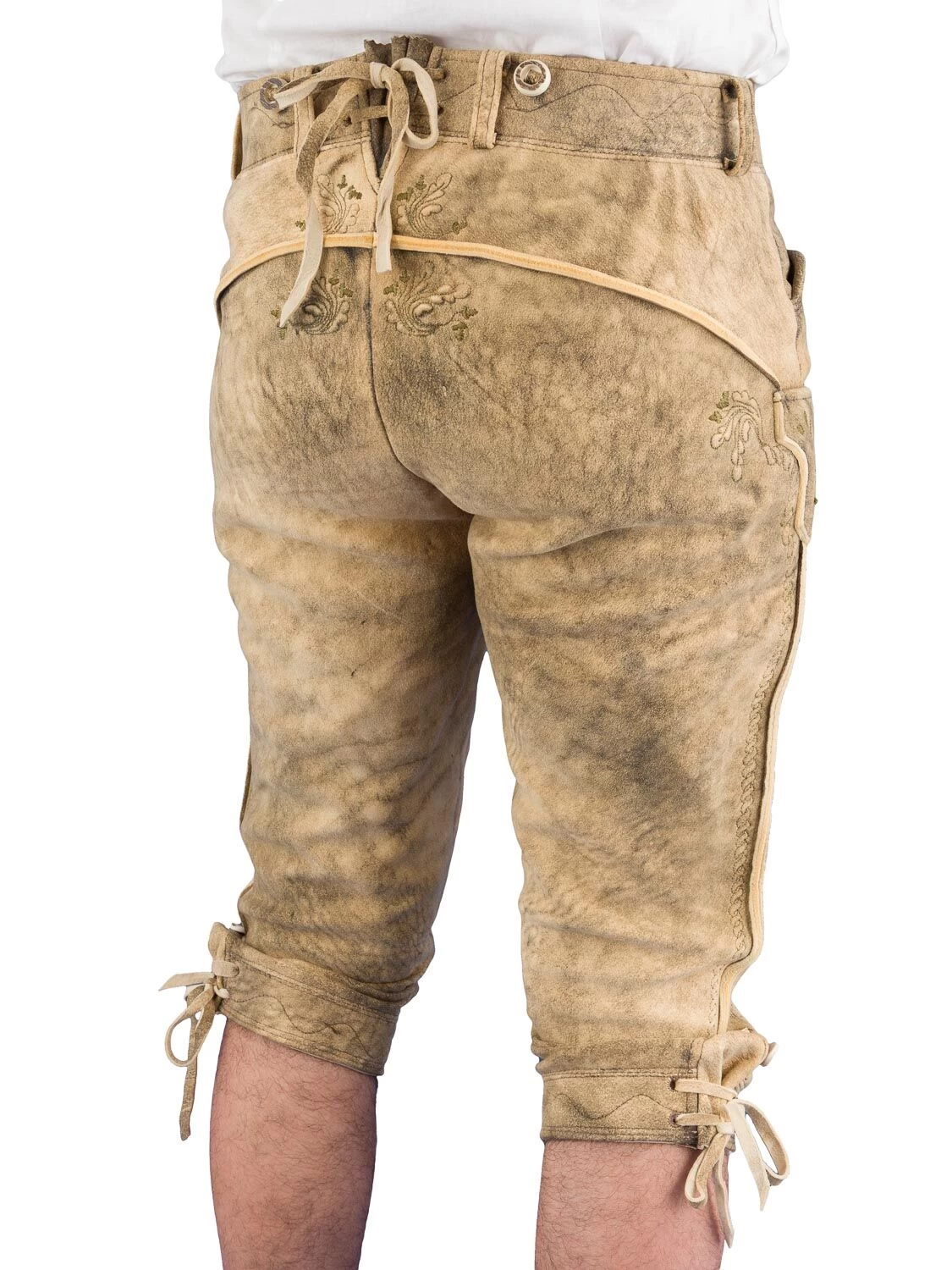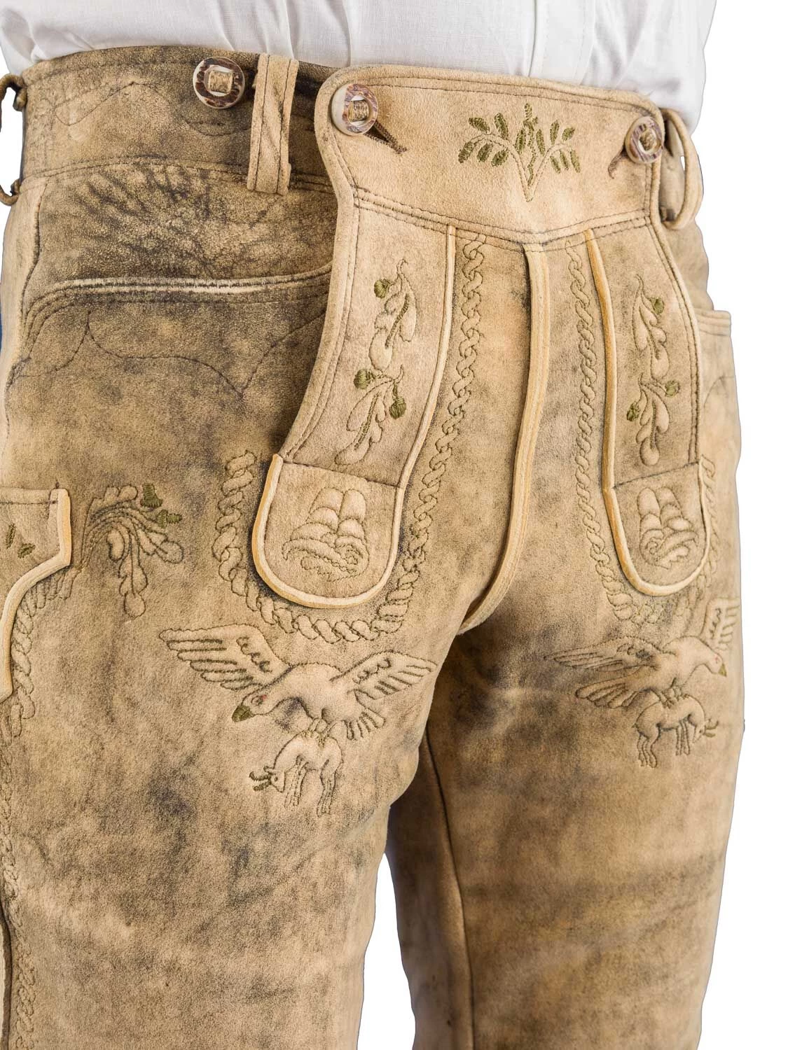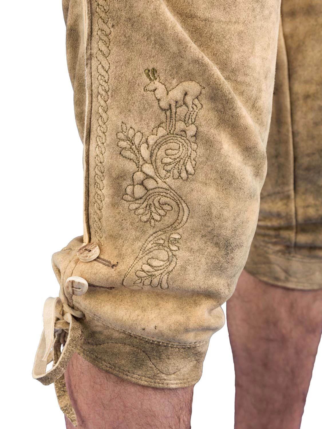 Die Kniebundlederhose Gamskogel ist aus echtem Hirschleder gefertigt. Diese Hose ist sämisch gegerbt und plastisch bestickt. Die gerauchte Optik wird per Hand sehr aufwendig mit Holzextrakt Farben gefärbt und zusätzlich auch per Hand nachgeschliffen.