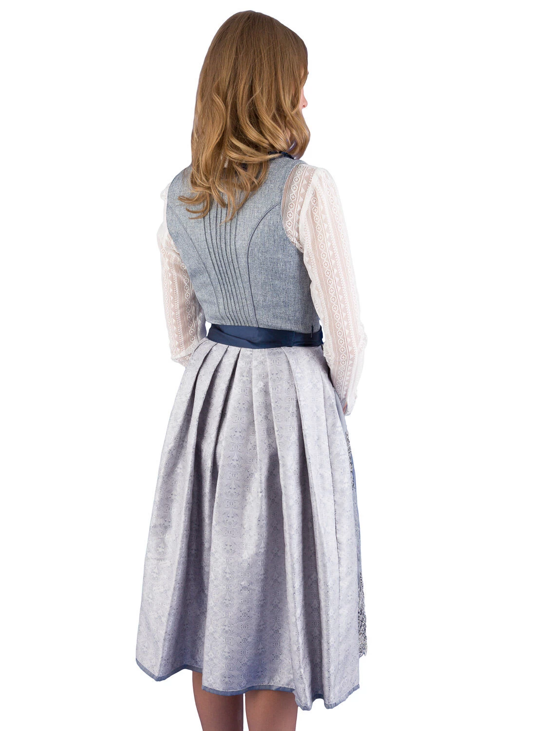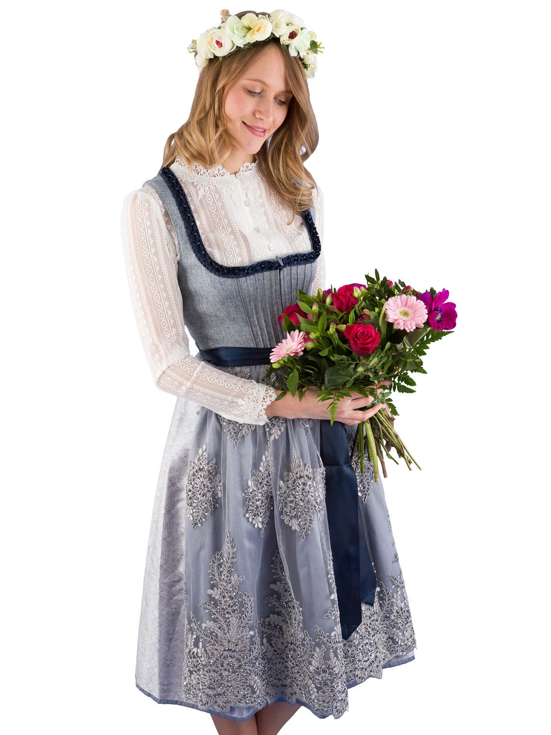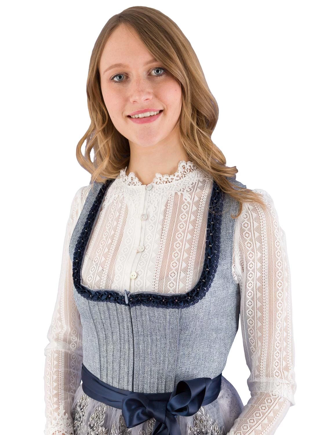 Hcohwertiges Midi Dirndl 19897 blau der Marke Krüger. Das Midi Dirndl ist mit vielen liebevollen Details ausgestattet. Den eckigen Ausschnitt zieren Froschgoscherl mit Perlen sowei eine Bordüre. Das festlche Dirndl wird vorne mit einem Reißverschluss geschlossen. Neben dem Reißverschluss sind Stützstäbchen eingearbeitet. Den Rücken zieren schöne Biesen. Der 70 cm lange Rock ist in Falten gelegt und hat beidseitig Eingrifftaschen eingearbeitet. Die bestickte Spitzenschürze ist mit Perlen verziert. Die Schürze ist blau unterfüttert.Das Satin Schürzenband ist dunkelblau.