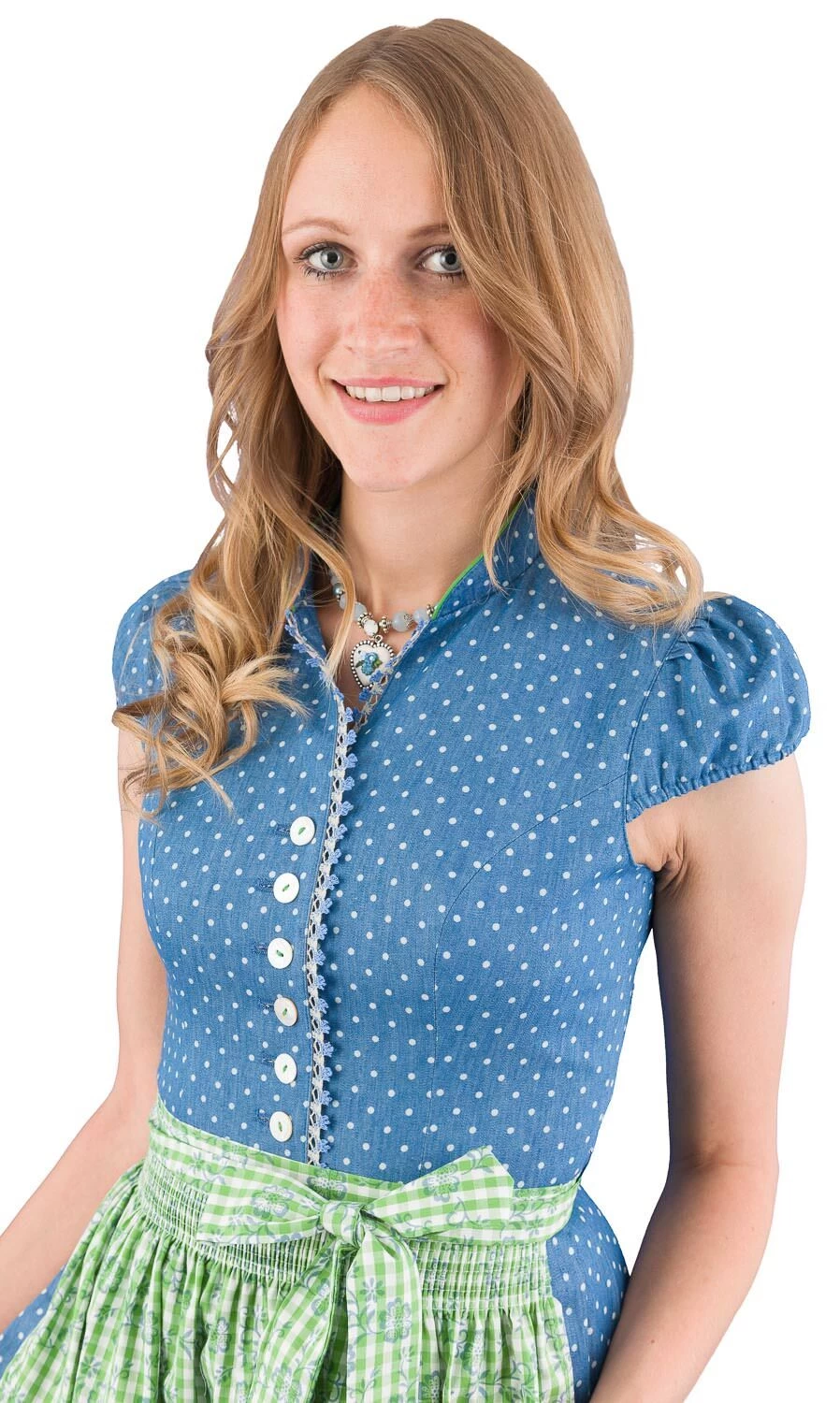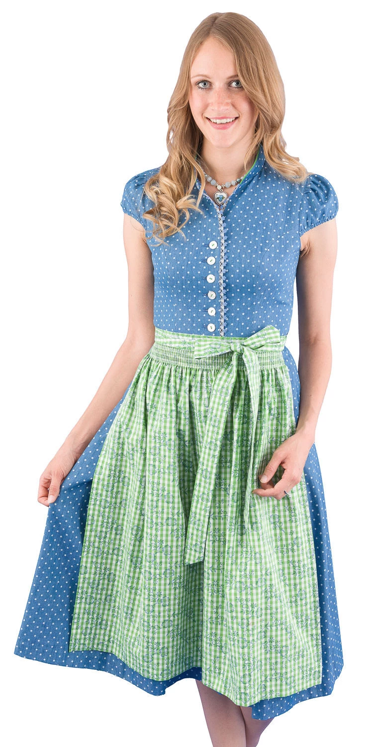 Neckisches Midi Dirndl Gunda/Susi blau grün 1350 der Marke H. Moser, Mode aus Salzburg. Das hochgeschlossene Baumwolldirndl mit Stehkragen wird vorne geknöpft. Der 70 cm lange Baumwollrock ist in Falten gelegt und hat rechts eine Tasche eingearbeitet. Die grün karierte Baumwollschürze ist mit einem blauen Blumendruck versehen.