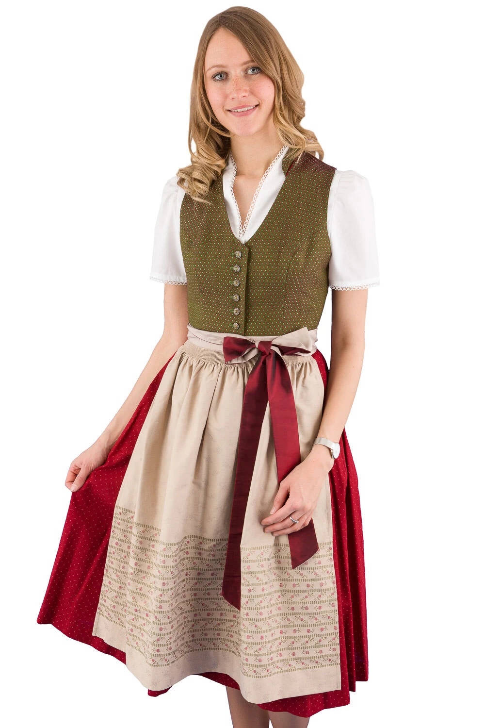Aktuelles Midi Dirndl Siehlsee grün rot der Marke Hammerschmid. Das Oberteil mit Stehkragen wird vorne mit hochwertigen in Altsilber gefasste Knöpfe geknöpft. Der 70 cm kirschrot getupfte Baumwollrock ist in Falten gelegt und hat beidseitig eine Tasche eingearbeitet. Die beige seidenmatte Schürze hat eine 24 cm breite Bordüre eingewebt. Das Schürzenband ist dunkelrot unterlegt.