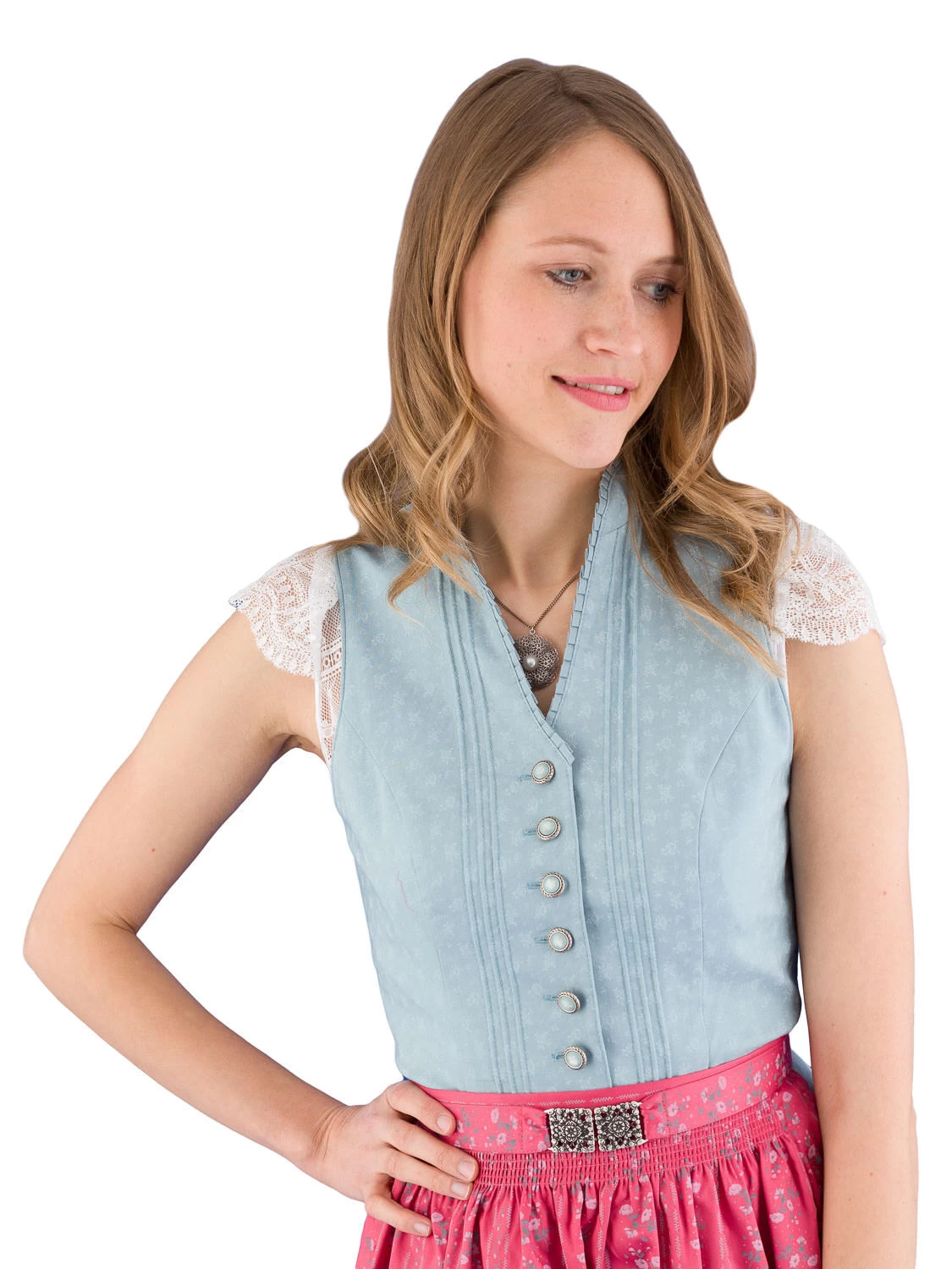 Aktuelles Mini Dirndl D211085 mit einer Rocklänge von 65cm der Marke Turi. Das Baumwolldirndl im Retrostil besticht mit vielen liebevollen Details. Das Vorderteil wird mit hochwertigen Knöpfen in eisblau mit Altsilbereinfass geknöpft. Beidseitig befinden sich jeweils 3 Bisen am Vorderteil des Mieders. Der 2,5 cm hohe Stehkragen und der V-Ausschnitt sind mit 1/2 cm breiten Falten eingefasst. Am 65 cm langen Faltenrock aus Baumwolle ist rechts eine Tasche eingearbeitet. Die tomantenrote gemusterte Baumwollschürze mit edler seidenmatter Oberfläche wird mit einer schönen Altsilberspange geschlossen. Dieses schöne, vielseitige Waschdirndl wurde nach Öko-Tex Standard 100 pflegeleicht und umweltschonend hergestellt