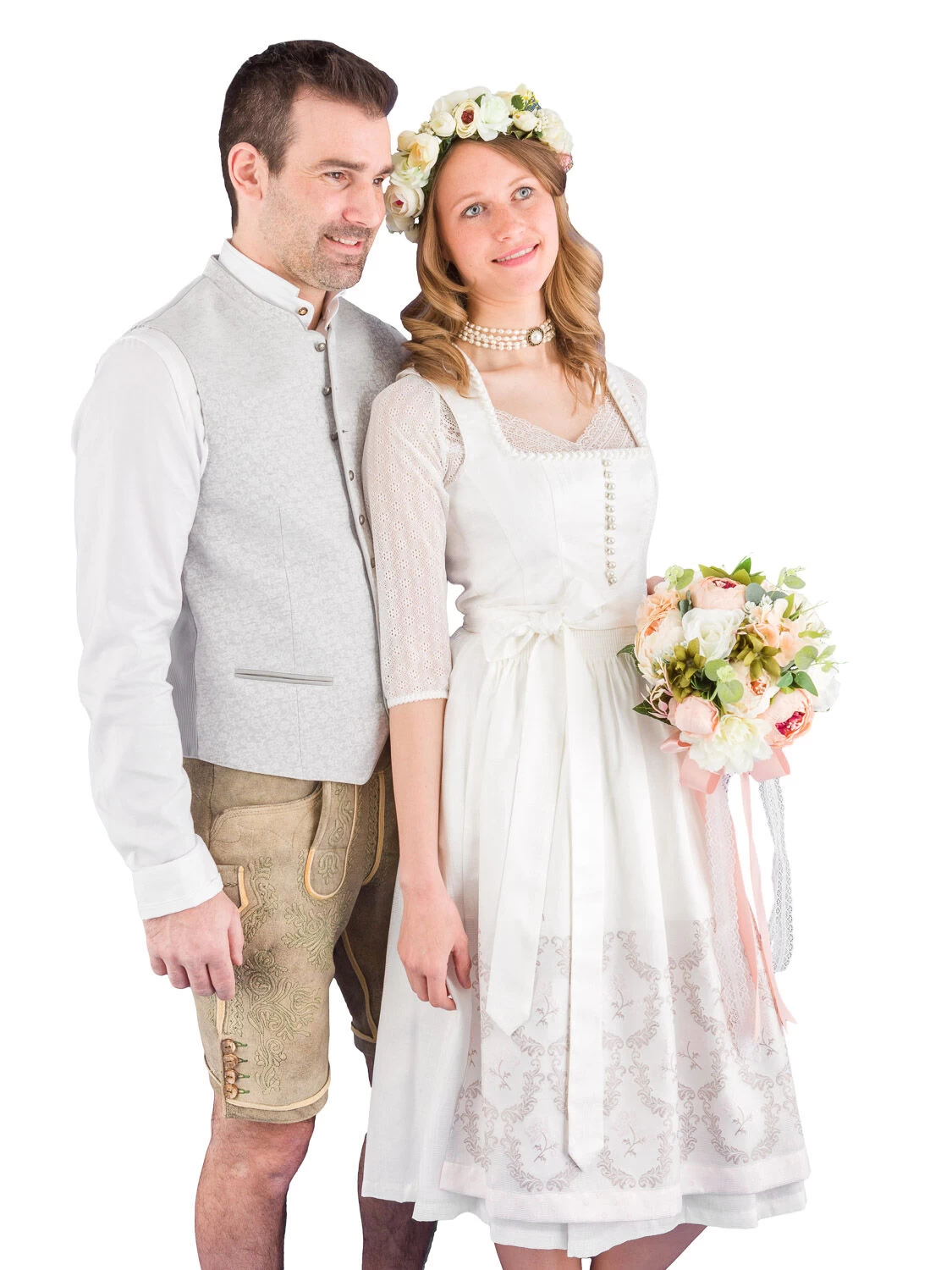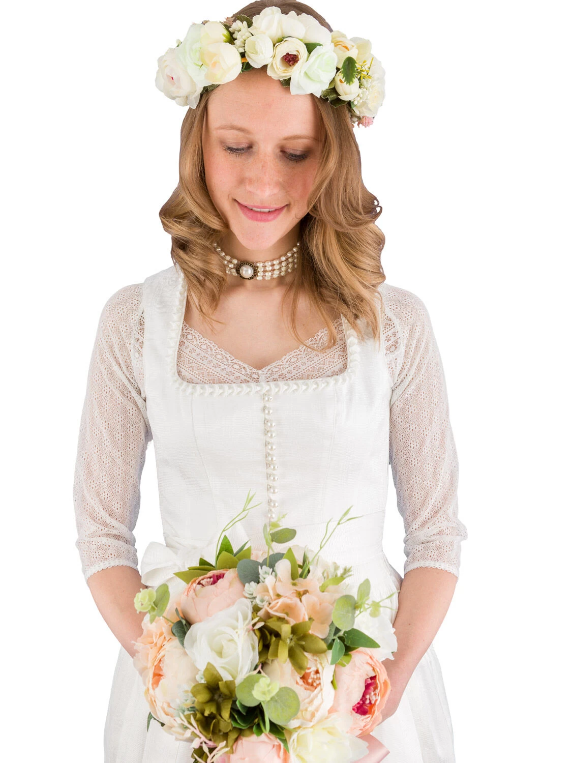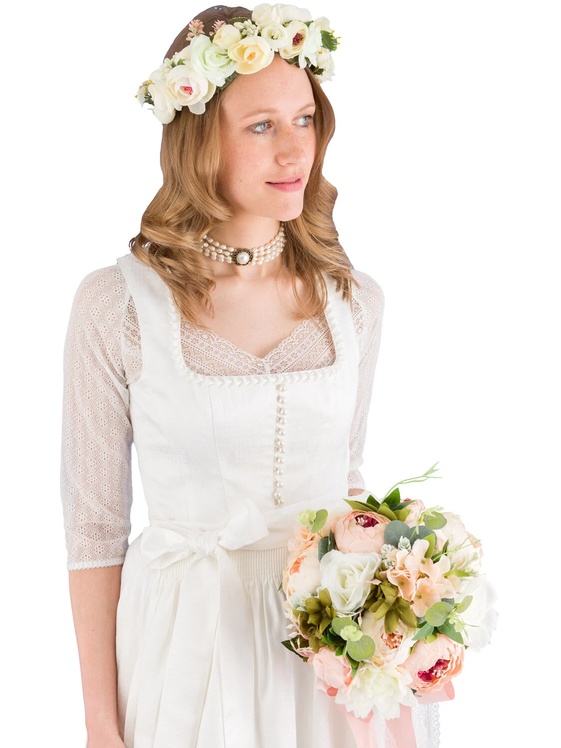 Ein traumhaftes Hochzeitsdirndl ist dieses Designerdirndl von der Marke Tramontana.Das zauberhafte Dinrdl ist aus hochwertigen cremfarbigen Webstoff geschneidert, der in sich gemustert ist. Der weite, gerade Ausschnitt ist von einer wunderschönen Herzrüsche gesäumt. Viele hochwertige Perlenknöpfe zieren das Mieder, das jedoch seitlich mit einem Reißverschluß geschlossen wird.Der 70 cm lange Rock ist in Falten gelegt und hat rechts eine Tasche eingearbeitet. Der Rock ist aus dem gleichen edel schimmernden Webstoff gefertigt wie das Mieder.Die Schürze verleiht dem edelen Hochzeitsdirndl nochmals einen besonderen Touch. Sie ist aus dem gleichen hochwertigen cremefarbigen Webstoff gefertigt wie Mieder und Rock. Jedoch sind in rosé Rosen und in beige Ornamente bis zur Hälfte eingewebt.Es wird dazu eine cremefarbige Dirndlbluse empfohlen und ein Dirndl BH, der das Dekolletè optimal zur Geltung bringt.Mit diesem zauberhaften Hochzeitsdirndl wird ihr schönster Tag perfekt.