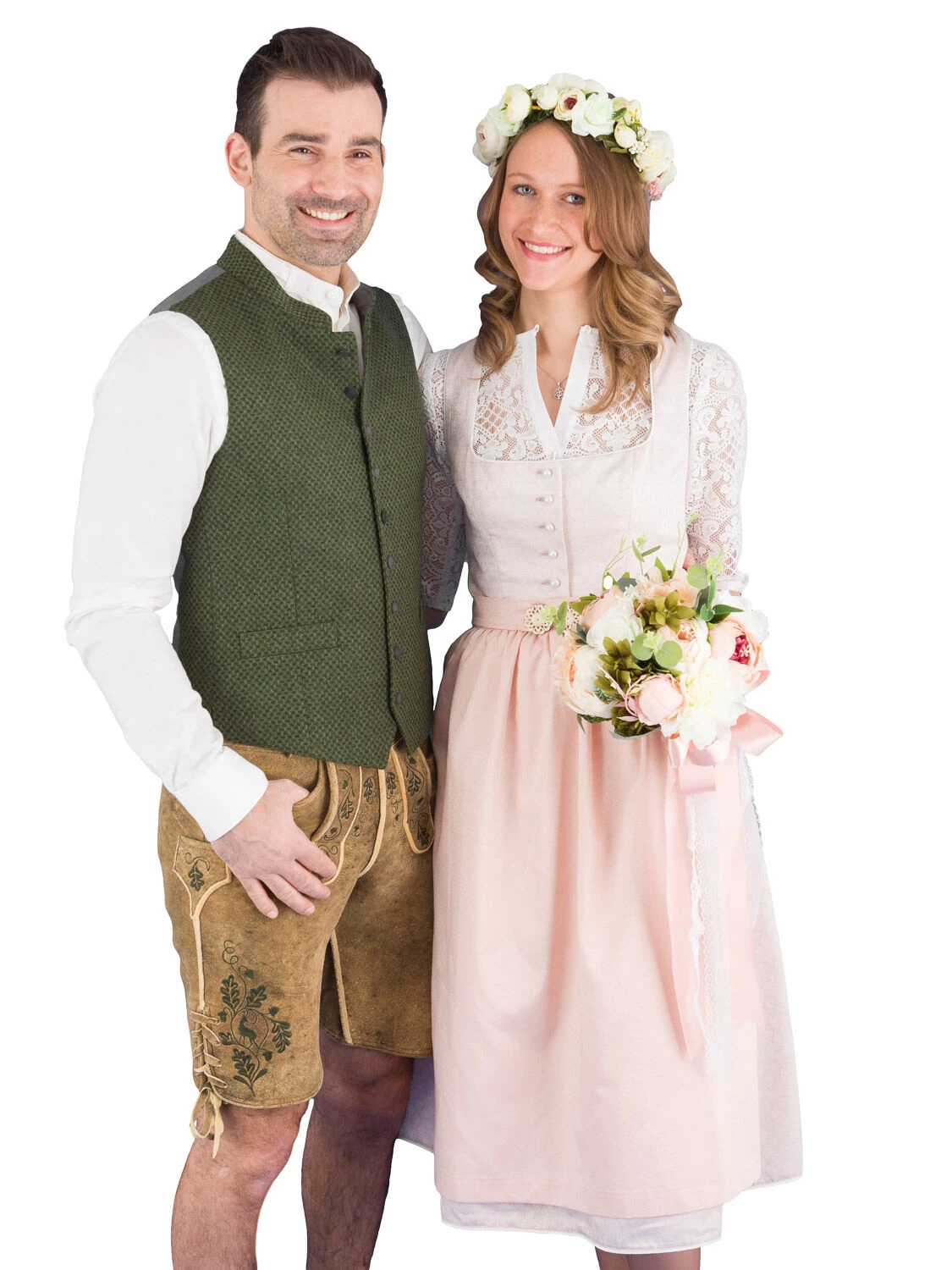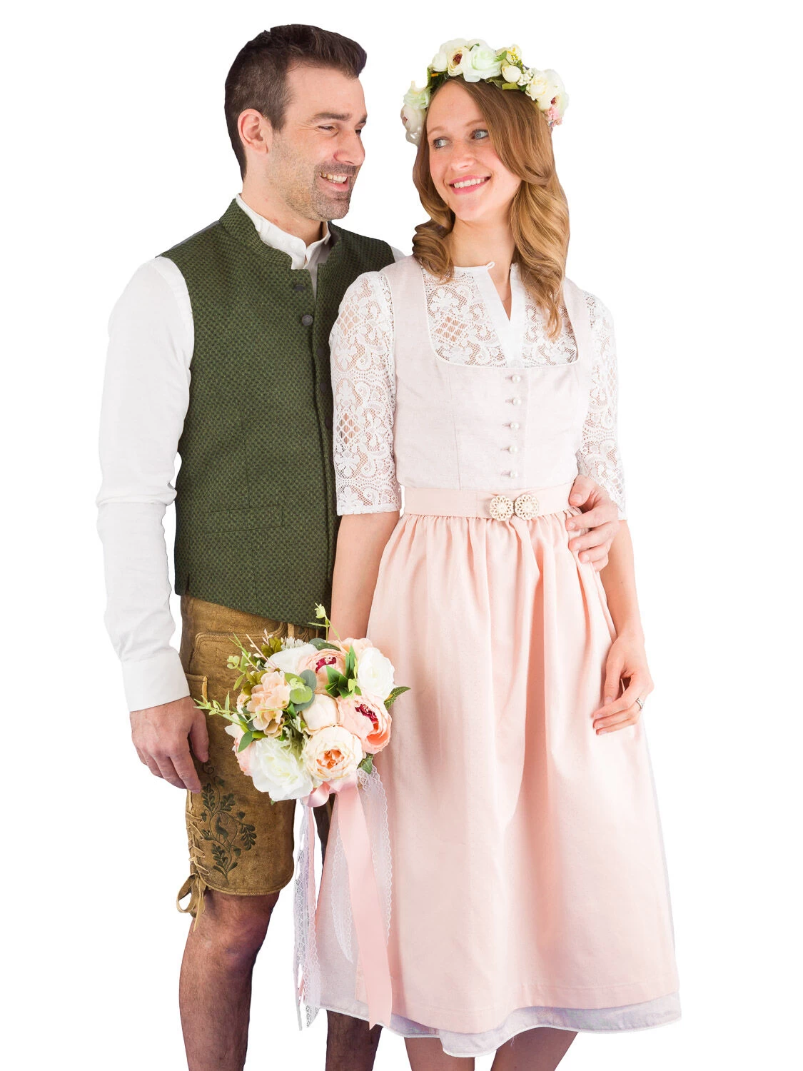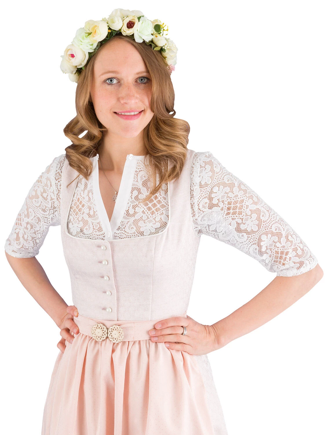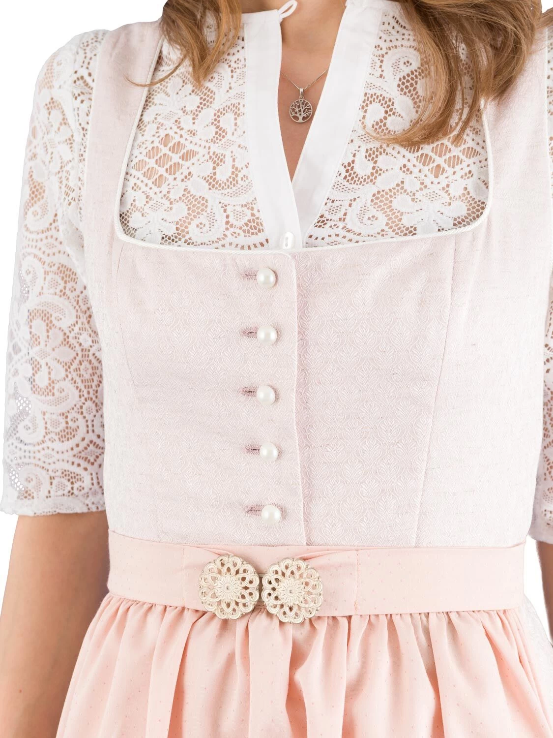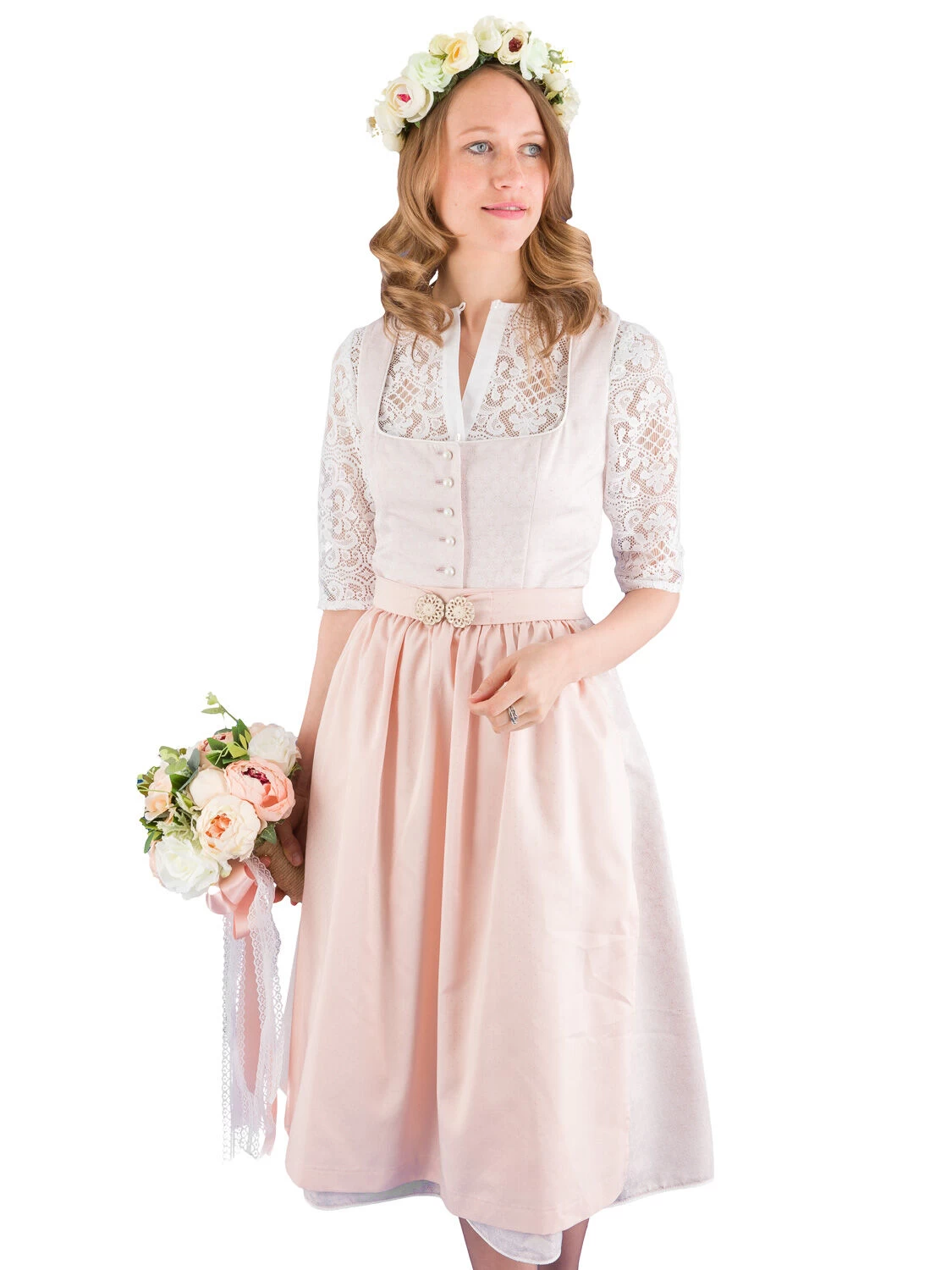 Das Midi Dirndl Bonny in rosé der Marke ALISSA by KINGA MATHE eignet sich besonders gut als Brautdirndl. Das Dirndl im klassishem Schnitt besticht mit einem leicht glänzendem Jacquard mit dezenten Ornamenten. Das Mieder wird mit wunderschönen Perlenschmuckknöpfen geknöpft. Formstäbchen im Mieder sorgen für einen perfekten Sitz. Der schlichte Ausschnitt und der Rocksaum sind mit einer farblich abgestimmten Paspel eingefasst. Der 70 cm lange Rock ist in Falten gelegt und verfügt über zwei seitliche Eingrifftaschen. Durch einen eingenähten Unterrock fällt der Rock besonders schön. Die einfarbige Schürze aus feinem Pünktchenjaquard wird mit einer schönen Schmuckspange vorne geschlossen. Dieses wunderschöne Dirndl begleitet Sie nicht nur an Ihren schönsten Tag im Leben, sondern wird Ihnen zu vielen Anlässen Freude bereiten.