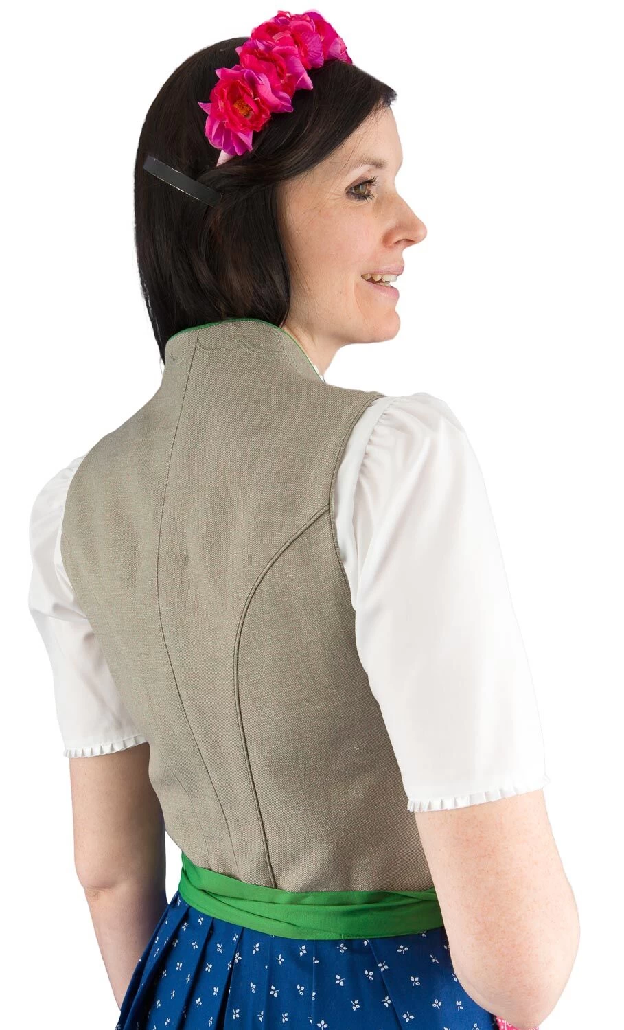 Hochwertiges Midi Dirndl Johanna 70 der Marke Wenger Austrian Style. Das Oberteil mit dem aktuellen Schneewittchenkragen ist aus dem klassischen Jägerleinen gefertigt. Es wird vorne mit echten Hirschhornknöpfen geknöpft. Schöne Biesen zieren den Ausschnitt. Der 70 cm lange blau Baumwollrock mit weißen Blumendruck ist in Falten gelegt und hat rechts eine Tasche eingearbeitet. Der Rocksaum ist mit einem 1,5 cm breiten grasgrünem Satinband eingefasst. Der Baumwollschürze in beere ist mit einem weißen Stoffdruck bearbeitet. Das Schürzenband ist aus grasgrünem Satin. Mit diesem zeitlosen Dirndl haben Sie ein Leben lang Freude.
