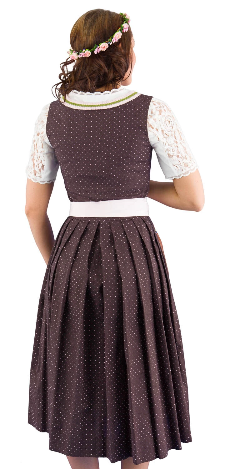 Hoch traditionelles Midi Dirndl Steinhaus braun aus dem Hause Sportalm Kitzbühl. Oberteil und Rock sind aus dunkelbrauner edler Baumwolle mit rosaroten Pünktchen überstreut. Den Ausschnitt ziert eine 2,5 cm breite rosa-grünen Faltrüsche aus Seide. Das Vorderteil wird mit schlichten Perlmuttknöpfen geknöpft. Der 70 cm lange, knitterarme Baumwollrock ist in Falten gelegt und hat rechts eine Tasche eingearbeitet. Ein besonderer Blickfang ist die wunderschöne schokoladenbraune weiche Baumwollschürze. Sie ist üppig mit Blumen bedruckt. Das rosa Schürzenband ist aus indischer Wildseide gefertigt. An einem Schürzenband ist aus Swarovski Steinen das Kitzbühler Wappen zu sehen. Dieses traditionelle Designerdirndl begleitet Sie auf viele Feste und Sie werden sich ausgesprochen wohlfühlen.