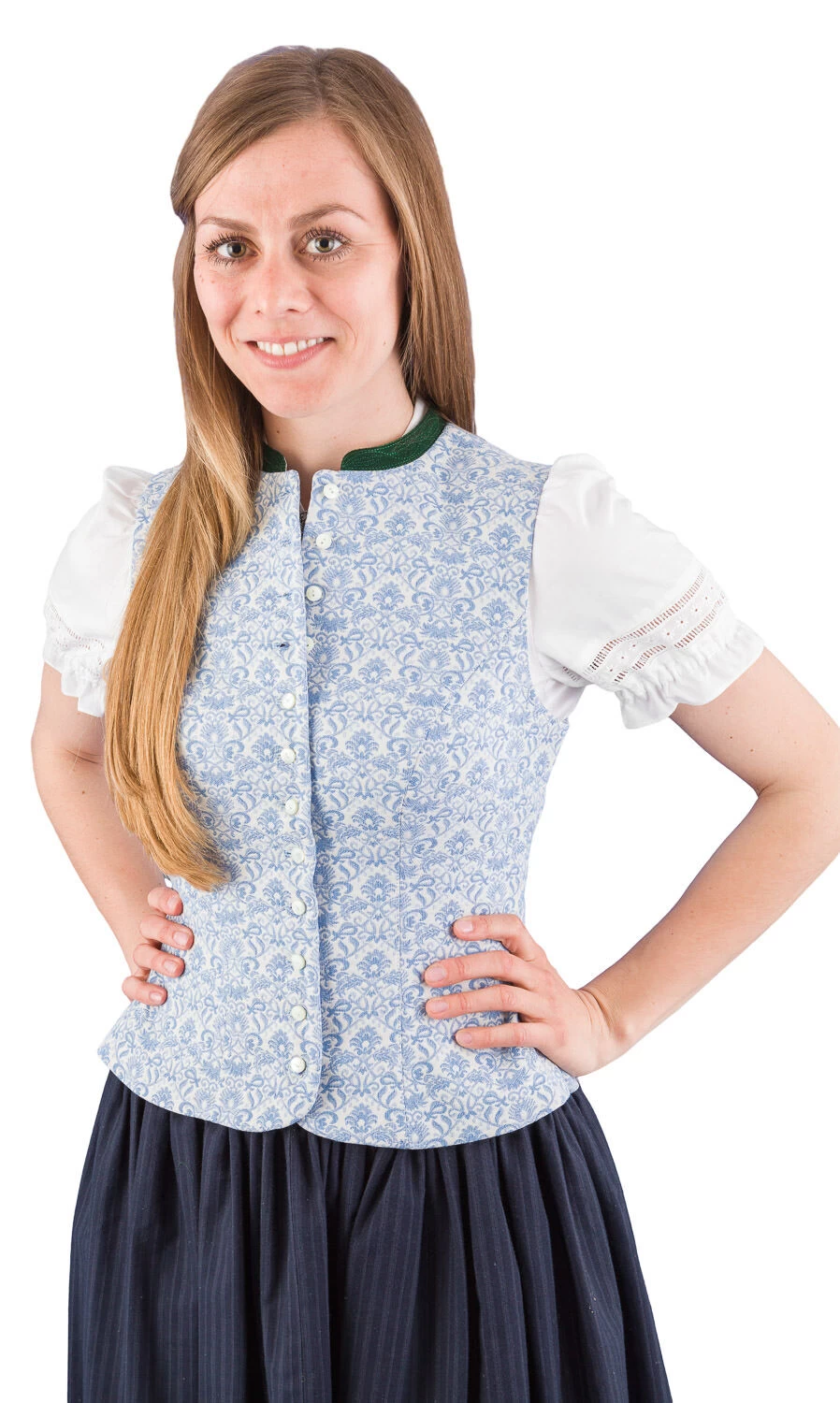 Hochwertiges Trachtenmieder hochgeschlossen LeniZLP Stretch eisblau der Marke Gottseidank. Das Mieder hat eine sehr gute bequemen Passform durch den Stretchanteil. Der tannengrüne Stehkragen ist 1,7 cm hoch und Ton in Ton bestick. Das Schößchen am Rücken ist 12,5 cm breit. Ob zur Tracht oder zur Jeans, mit diesem Mieder sind Sie immer bestens gekleidet.