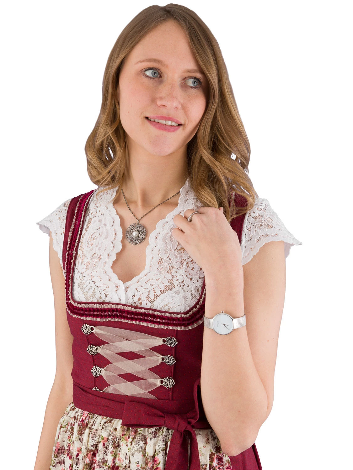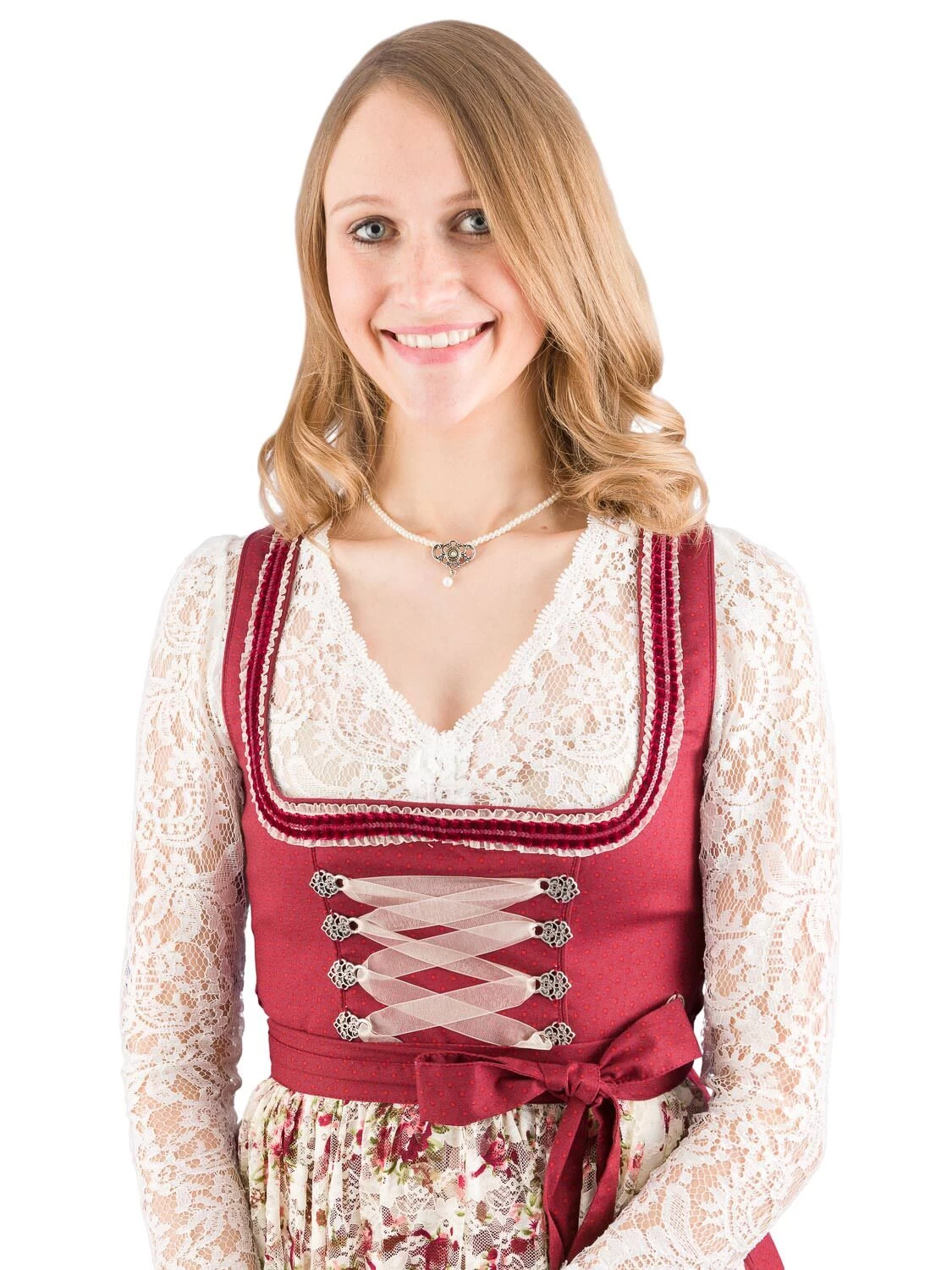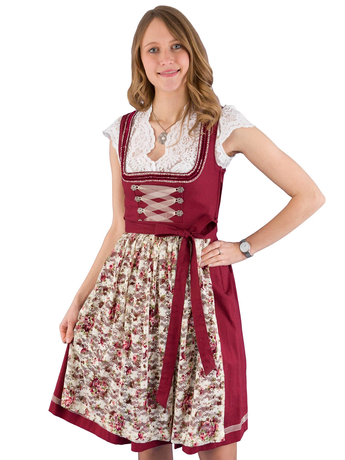 Mini Dirndl Dalinda bordeaux/creme der Marke MarJo. Das Dirndl besticht mit einer wunderschönen, mit Rosen bedruckten, Spitzenschürze. Das Schürzenband ist bordeaux-rot getupft, wie das Oberteil und der Rock. Das Mini Dirndl wird seitlich mit einem Reißverschluss geschlossen. Der 58 cm lange Baumwollrock ist in Falten gelegt und hat rechts eine Tasche eingearbeitet. Über der Rocksaum ist ein 1,5 cm breites creme farbiges OrganzaBband angenäht.