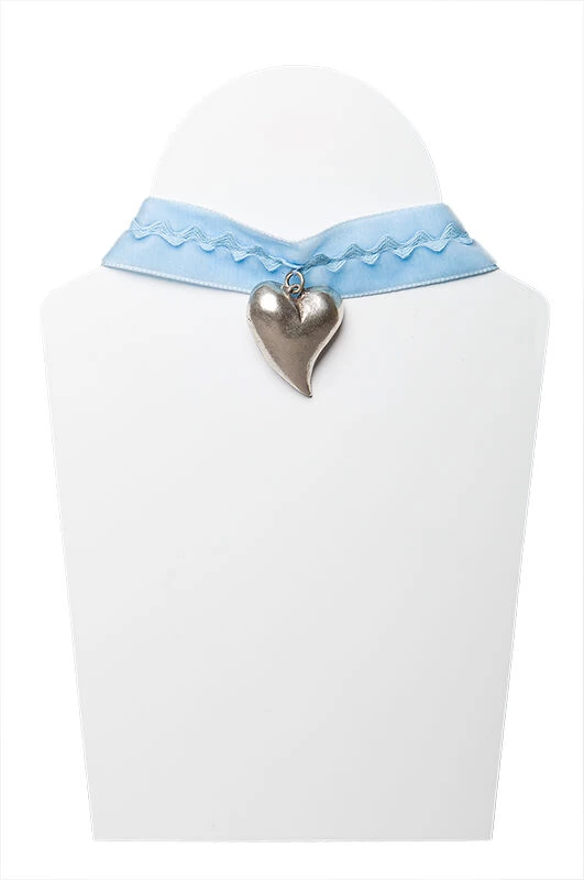 Schönes Samtkropfband in hellblau und einem Altsilberherz. Das Kropfband ist zusätzlich mit einer Zackenlitze verziert. Hinten ist eine Kette angebracht um die Weite zu verstellen. Von diesem Kropfband wurden exklusiv nur 10 Stück produziert