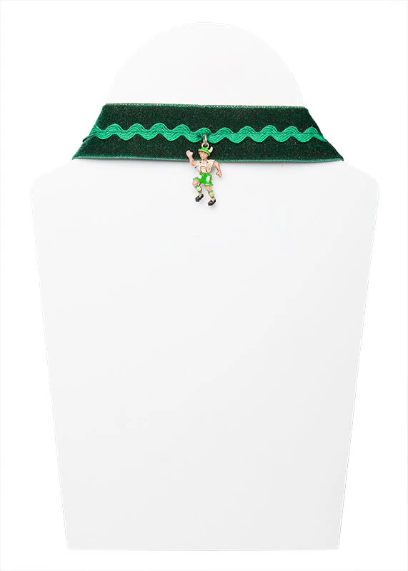 Samtkropfband tannengrün mit Anhänger bayrisch bekleideter Tänzer. Das Kropfband ist mit einer grasgrünen Zackenlitze verziert. Hinten ist ein Verschluss mit Kette, um die Weite zu regulieren. Von diesem schönen Kropfband wurden exklusiv nur 10 Stück gefertigt.