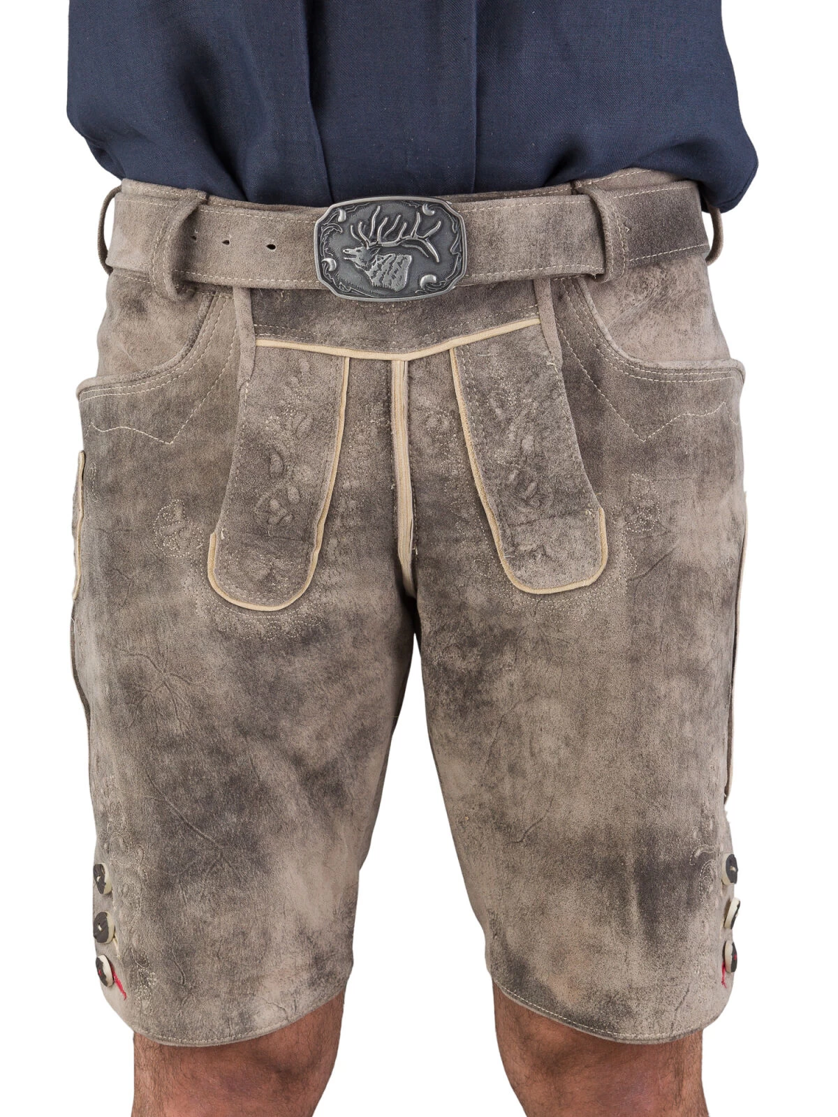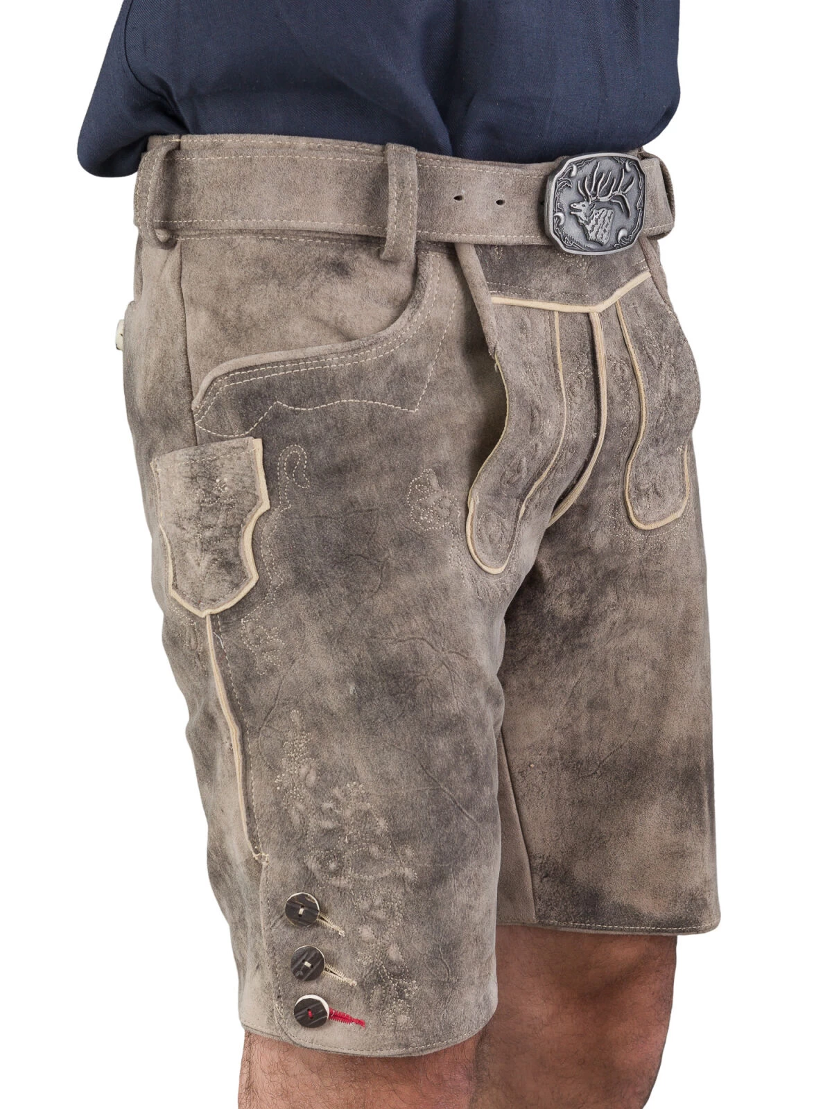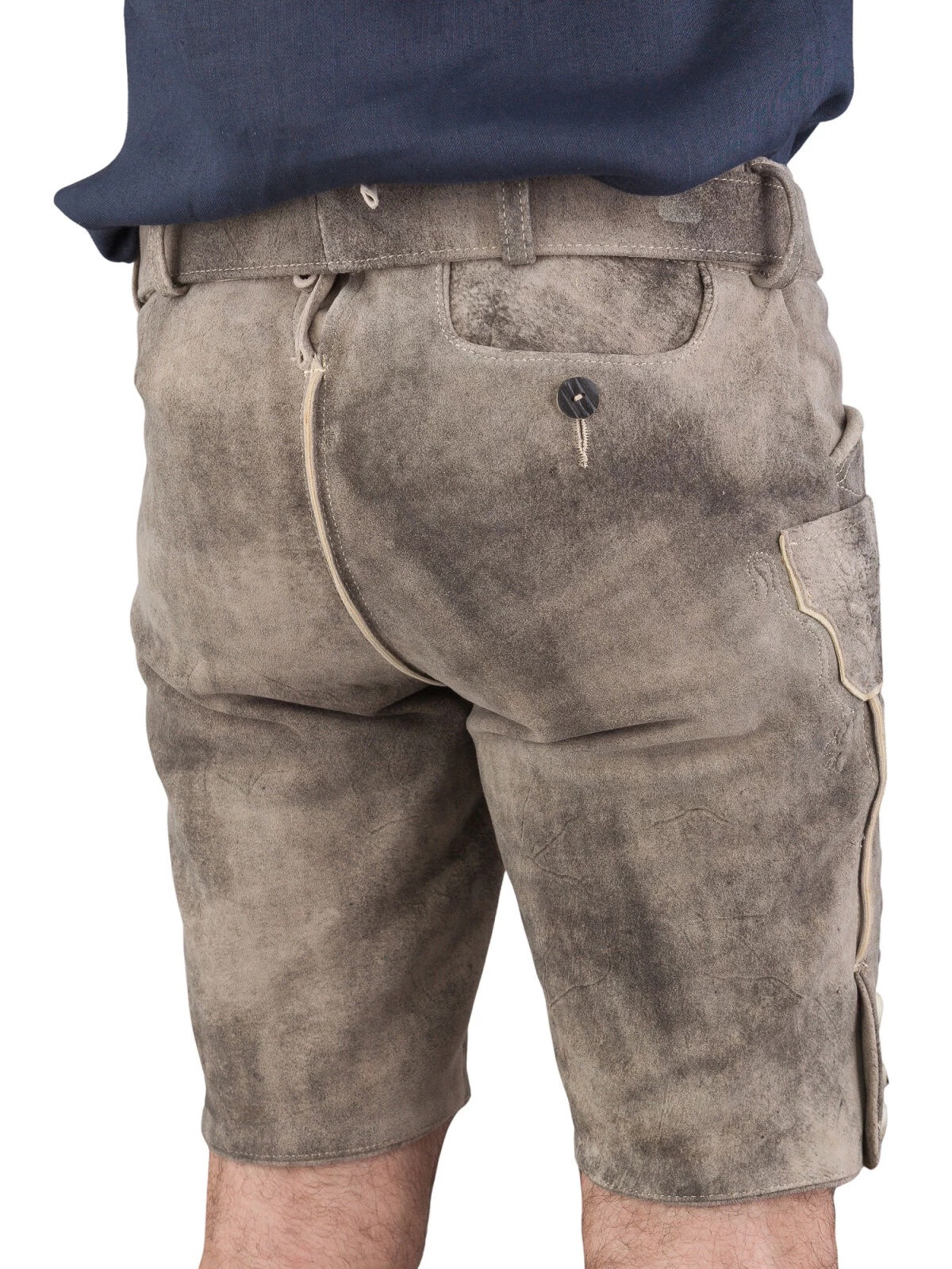 Die Beinabschlüsse der kurzen Lederhose sind mit Hirschhornknöpfen versehen, die nicht nur optisch ansprechend sind, sondern auch einen authentischen Look garantieren. Zudem unterstreicht das rote Knopfloch am Beinende die Liebe zum Detail und setzt einen raffinierten Farbakzent.
