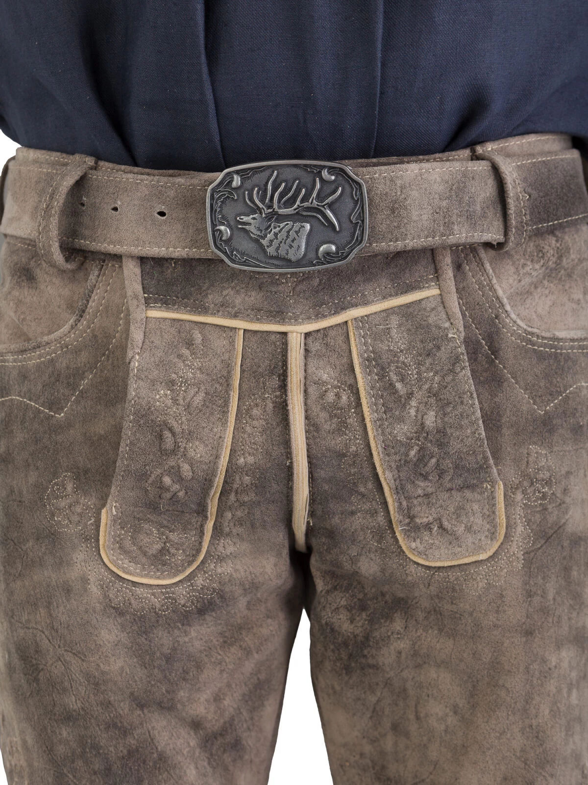 Funktionalität und Eleganz gehen Hand in Hand: Der Gürtel mit Altsilberkoppel Hirschkopf ist im Lieferumfang enthalten und rundet das Gesamtbild perfekt ab. Die Riegel am Bund sorgen für eine optimale Passform, während die Gesäßtasche praktischen Stauraum bietet.