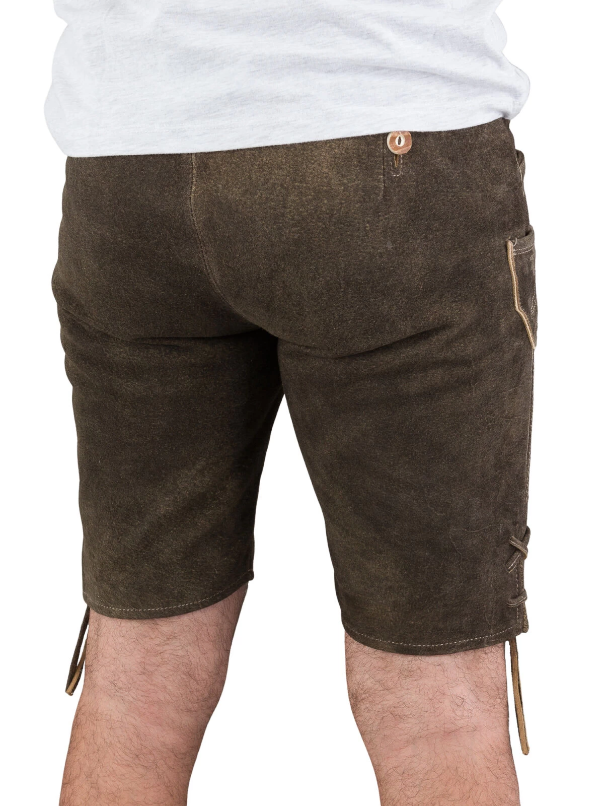 Die Beinabschlüsse dieser exklusiven Lederhose sind mit Bändern versehen, die für einen optimalen Sitz sorgen und zugleich ein stilvolles Detail darstellen. Der im Lieferumfang enthaltene Gürtel mit einer hochwertigen Altmessingkoppel Hirsch setzt das i-Tüpfelchen auf das Erscheinungsbild dieser Trachtenhose.