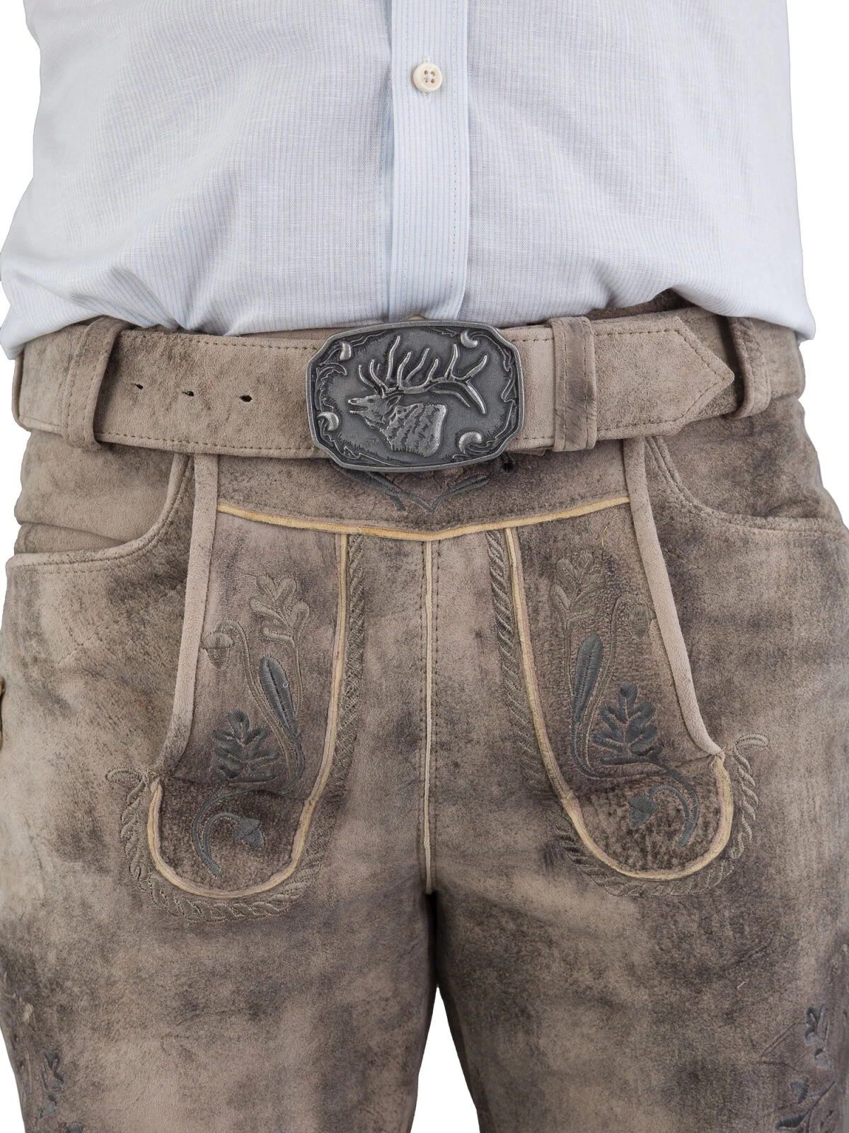 Ein besonderes Highlight dieser Lederhose ist der mitgelieferte Gürtel, der mit einer eindrucksvollen Altsilberkoppel mit einem Hirschkopfes versehen ist. Dieses detailverliebte Design macht die Hose zum absoluten Hingucker und lässt Sie stets gut gekleidet aussehen.
