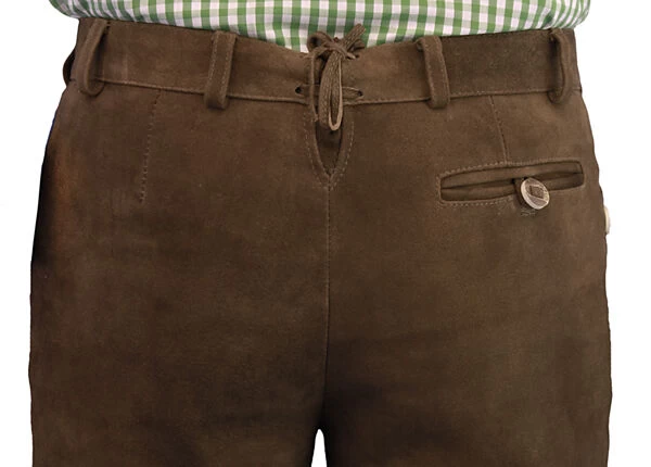Die lange Lederhose Rohrdorf in der Farbe murmel ist aus sehr weichem Ziegenvelours gefertigt und hat ein sehr gute Passform. Die plastische Stickerei am seitlichen Bein ist Ton in Ton gehalten und leicht auf Used abgewetzt. Am Bund sind Gürtelschlaufen angebracht und hinten ist ein Riegel um die Bundweite zu regulieren. Am Gesäß hinten befindet sich eine paspelierte Gesäßtasche, die mit einem Knopf geschlossen ist. Am rechten Bein befindet sich eine paspelierte Messertasche.