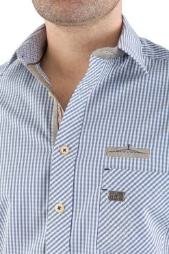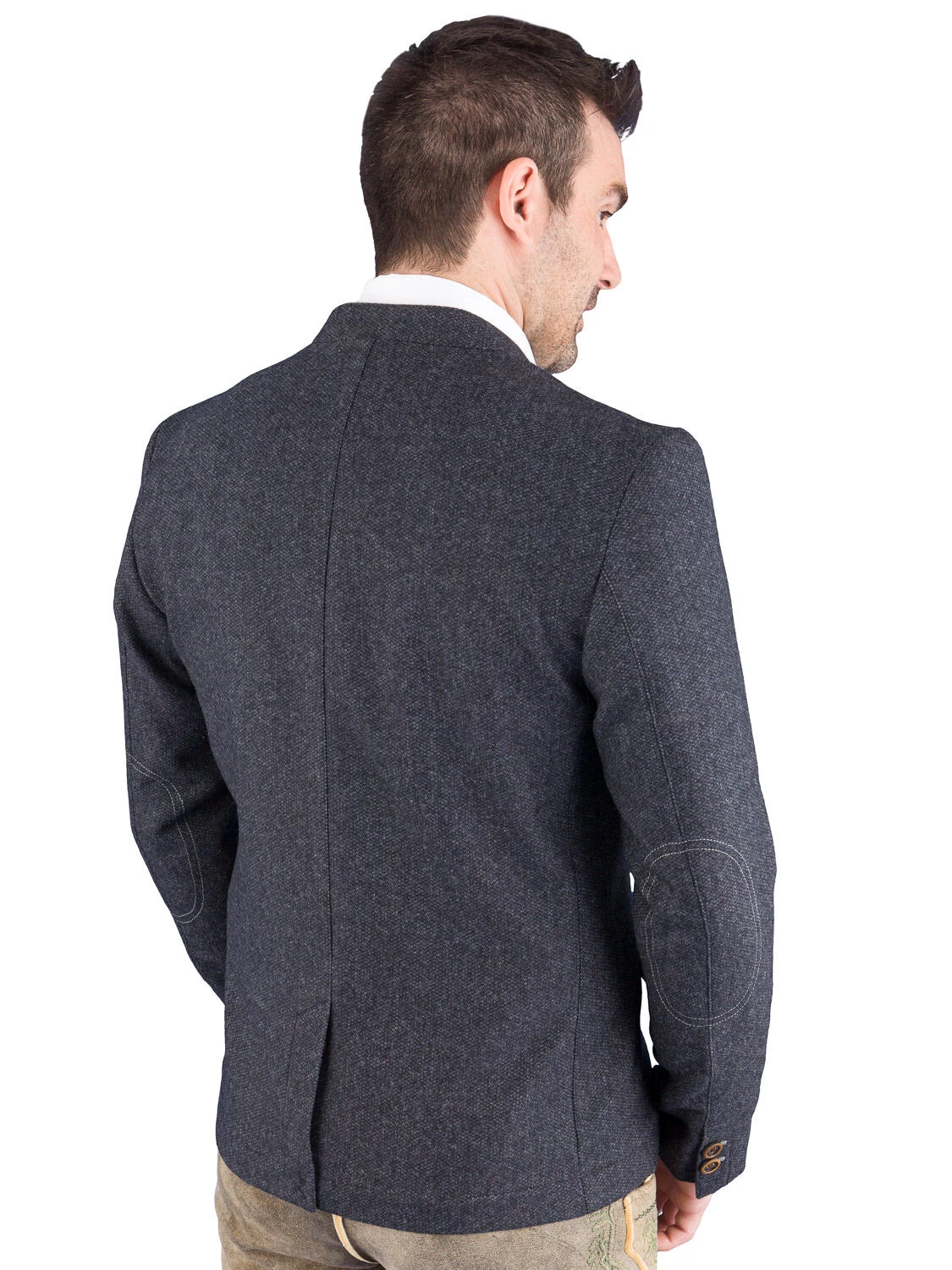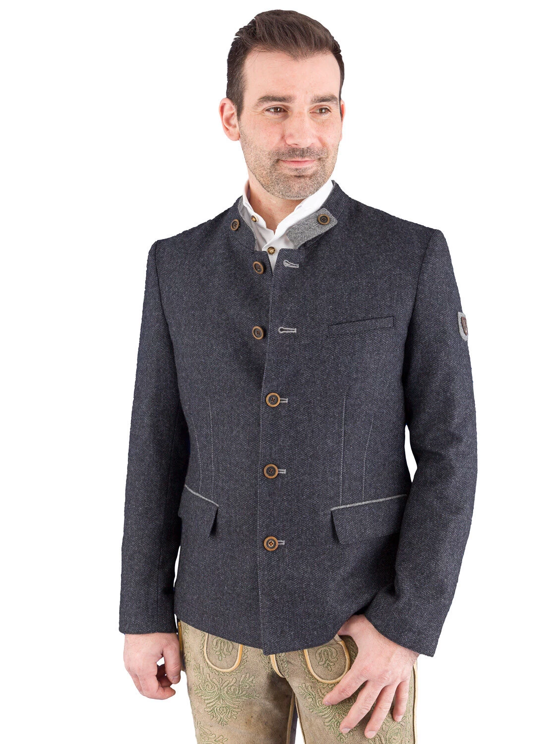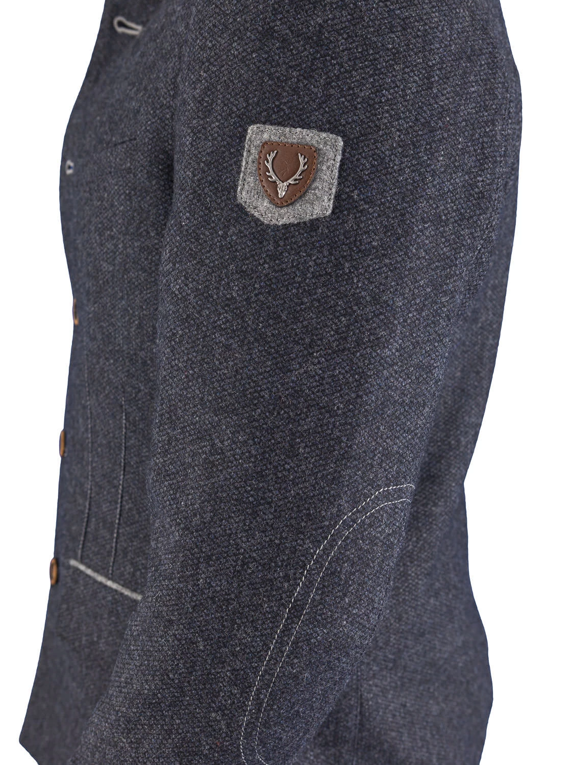 Stilvolle, modische Trachtenjacke Neubrunn in blau/mittelgrau der Marke Spieth & Wensky. Die Jacke ist leicht tailliert und passt sowohl zur Lederhose als auch zur Stoffhose oder Jeans. Das Sakko ist mit einem 3 cm hohen Stehkragen gefertigt. Der Stehkragen ist mit einem hellgrauen Loden unterfüttert. Eine Lasche wird mit einem Knopf zurück geknöpft. Hochwertige Knöpfe und hellgrau gesteppte Biesen sind ein besonderer Blickfang dieses schönen Sakkos aus Wollmix. Ein zusätzlicher modischer Akzent ist der doppelte ovale Stick an den Ellbogen. Der gerade Rücken ist in der Mitte unten 16 cm hoch überdeckt geschlitzt. Das Trachtensakko ist teilgefüttert und mit 2 Innentaschen ausgestattet. Am linken Ärmel befindet sich ein stilvoller Aufnäher mit Hirschkopf.
