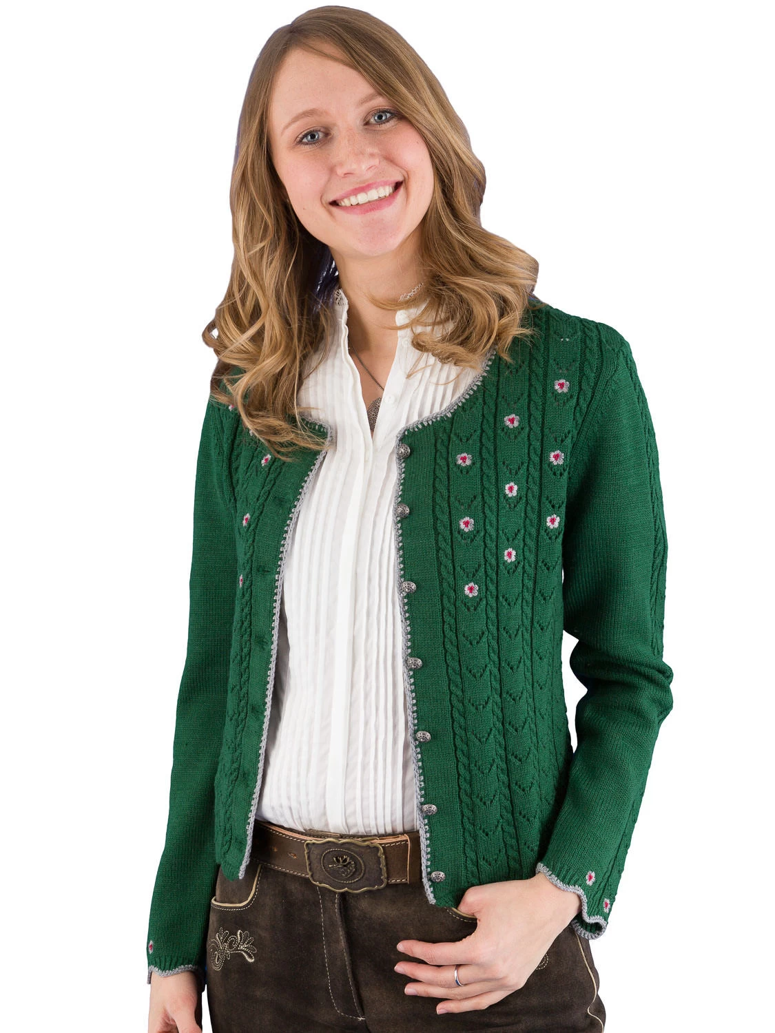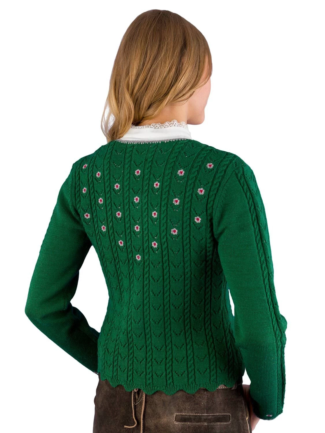 Traditionelle Trachten Strickjacke Nastalgie der Marke Spieth & Wensky. Die Trachtenjacke in dunkelgrün ist hellgrau eingefasst. Die hochwertige Strickjacke in Merinowolle ist mit verschiedenen Strickmustern versehen. Grau-rote Blumen sind am Vorderteil und am Rücken aufgestickt. Ebenso zieren 3 aufgestickte Blumen den Ärmelabschluss. Die Jacke wird mit schönen Altsilberknöpfen geknöpft. Die hochwertige Merinowolle sorgt dafür, dass die Jacke nciht kratzt.