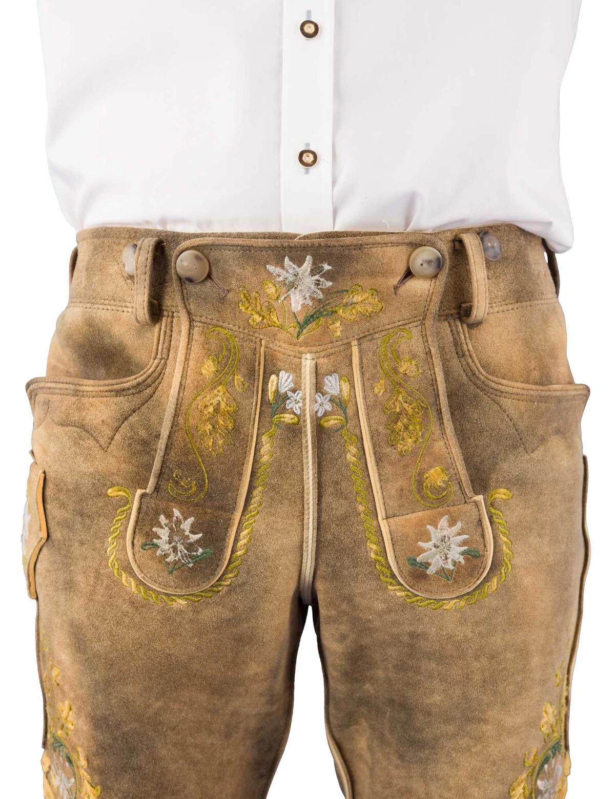 Meindl Lederhose Spitzingsee Altschwarz – mit ausgefallener Stickerei: Die kurze Lederhose Spitzingsee von Meindl in der Farbe Altschwarz beeindruckt mit prachtvoller Stickerei in Weiß, Gelb und Grün und einem ungewöhnlichen Motiv. Das Edelweiß prangt in zahlreichen Versionen auf dem Hosenlatz und an den Hosenbeinen. Auffallende Ziersteppnähte auf den Vorderteilen, den vorderen Einschubtaschen und am Bund ergänzen die Stickerei, die perfekt mit dem hellen Ton der sämisch gegerbten Hirschhaut harmoniert.