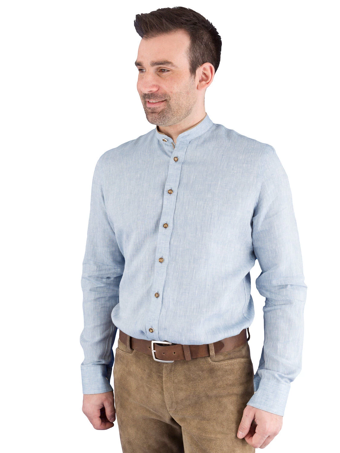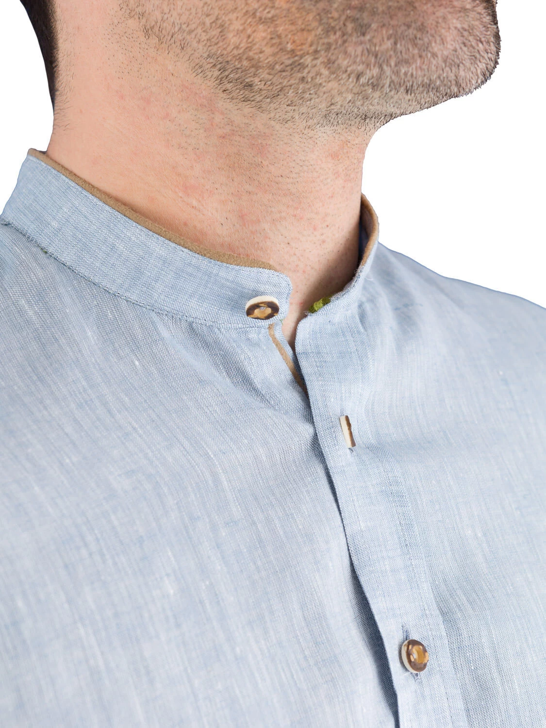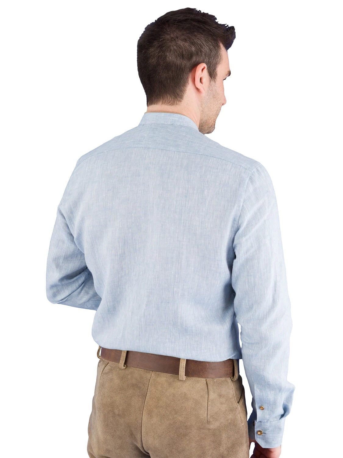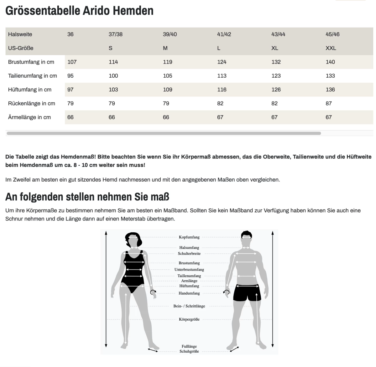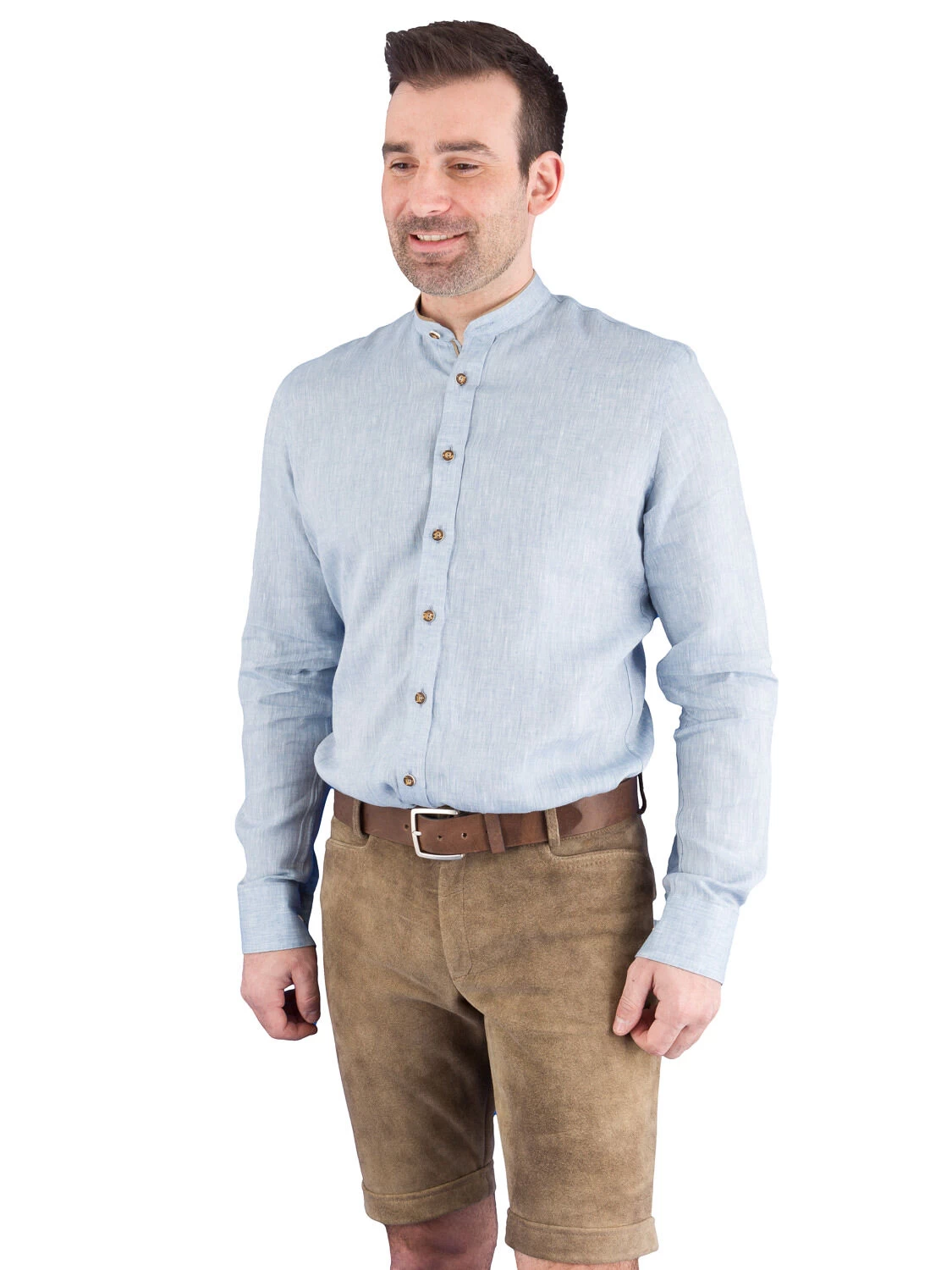 Hochwertiges Leinenhemd in jeansblau vom Markenlabel Arido. Das Langarmhemd im Modern Fit Schnitt besticht mit seinem außergewöhnlichen Stoff und viel Liebe zum Detail. Am 2,5cm hohen Stehkragen ragt ein hellbraunes Lederpaspel hervor. Dieses findet sich auch an der Knopfleiste und an der Manschette innen wieder. Die Hirschhornknöpfe harmonieren perfekt zum Design. Das Trachtenhemd lässt sich wunderbar zur Lederhose oder auch zur Jeans kombinieren.Bitte Größentabelle beachten und die Maße mit einem gut sitzendem Hemd vergleichen.