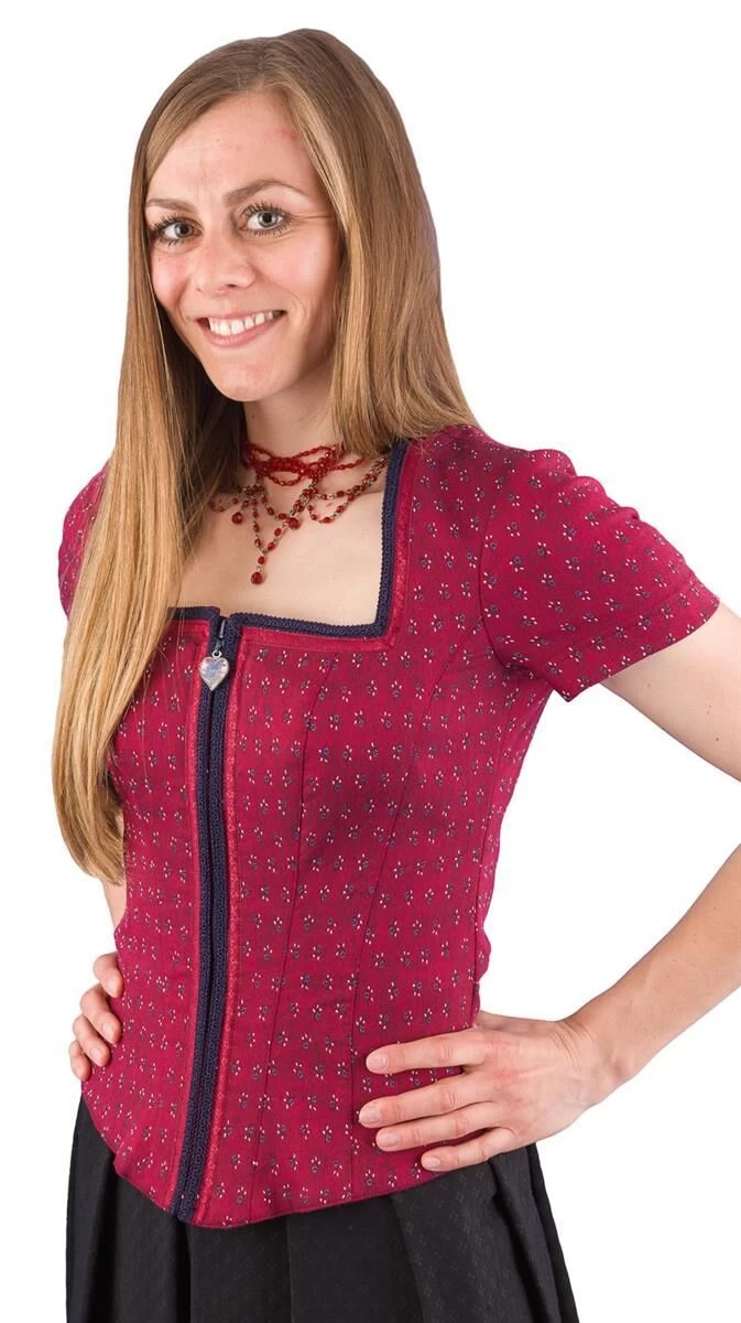 Ärmelmieder Stretch 30247 weinrot-marine der Marke Country Line. Das bequeme Mieder wird vorne mit einem Reißverschluss geschlossen. Am Zipper hängt ein Herz mit Enzianbild dran. Um den Ausschnitt und entlang des Reißverschlusses ist eine marineblaue Bordüre angebracht. Seitlich und am Rücken sind 5 cm lange Schlitze eingearbeitet, die für eine gute Passform sorgen. Durch den Stretchanteil trägt sich das Trachtenmieder sehr bequem. Die Rückenlänge bei Gr- 34 beträgt 50 cm. Das Mieder fällt eine Nummer größer aus. Deshalb bitte eine Nummer kleiner bestellen.
